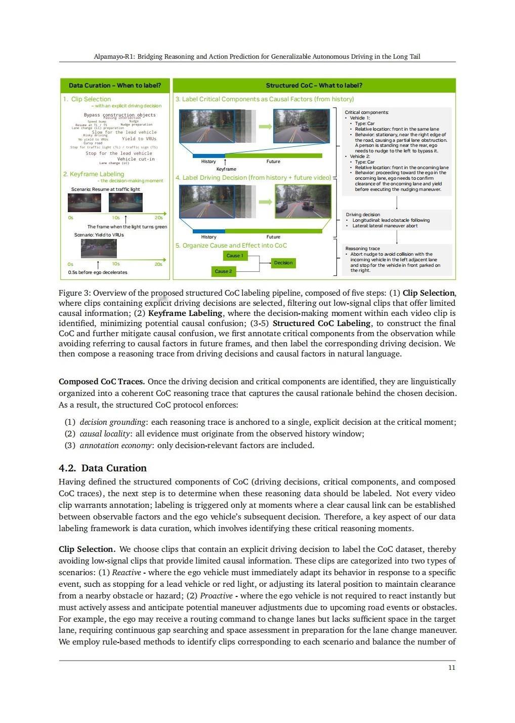 * 标注流程: 数据集通过“自动标注”和“人机回圈” (human-in-the-loop) 的混合流程构建。该流程一个关键步骤是“关键帧标注” (Keyframe Labeling),即精确定位驾驶决策发生的瞬间(例如,在自我车辆开始减速前 0.5 秒),确保所有因果因素都源自可观察到的历史窗口,从而防止因果混淆。