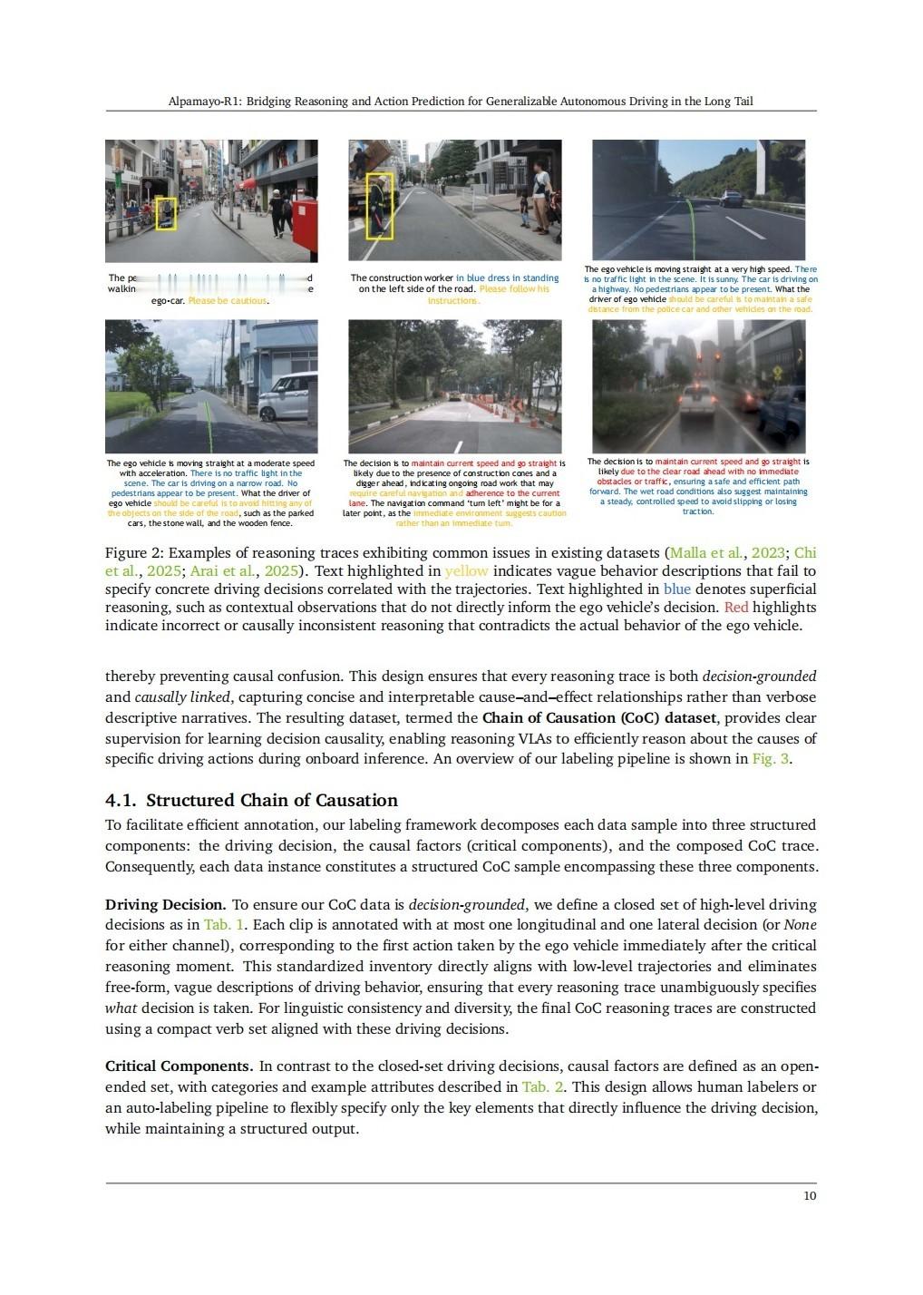 * 关键组件 (Critical Components): 标注员从一个“开放集合”中识别出直接导致该决策的因果因素(例如“关键物体”、“交通信号灯状态”、“车道线类型”)。