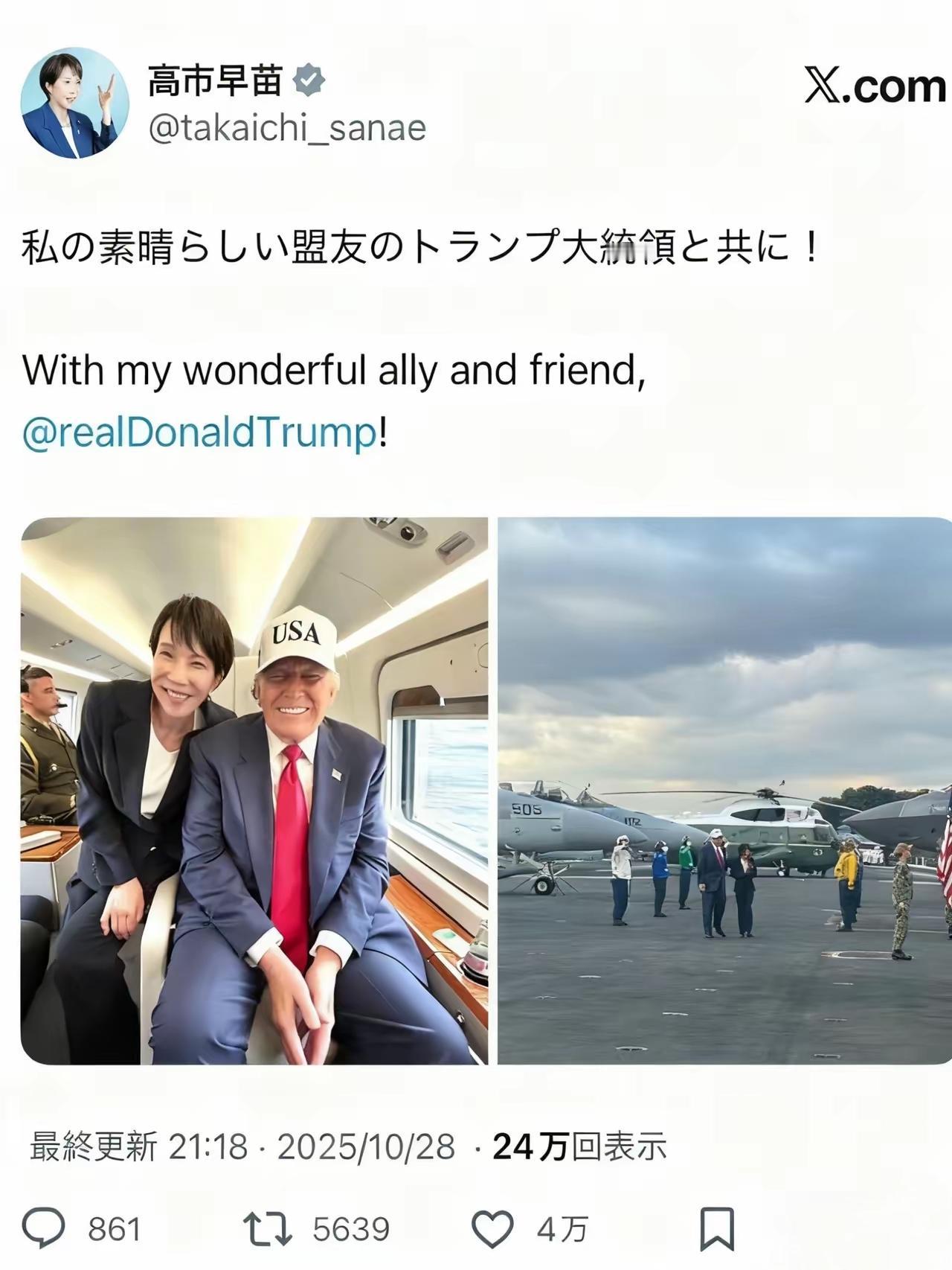 事实证明,特朗普很懂女人的心! 高市早苗这两天疯狂炫朋友圈。从她看特朗普的每一个眼神可以看出,她已经完全沦陷在特朗普的糖衣炮弹中。特别是特朗普的那些承诺——“我一直很爱日本,只要日本需要,只要我能做到,我会全力以赴……”。 图片1为高市早苗发布推文:和我出色的盟友兼朋友(特朗普总统)在一起!
