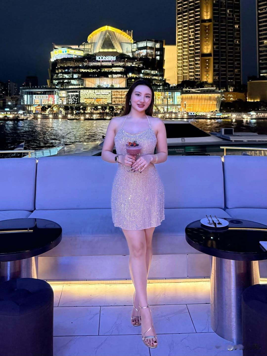 夜幕下的城市霓虹,优雅女子享受时光