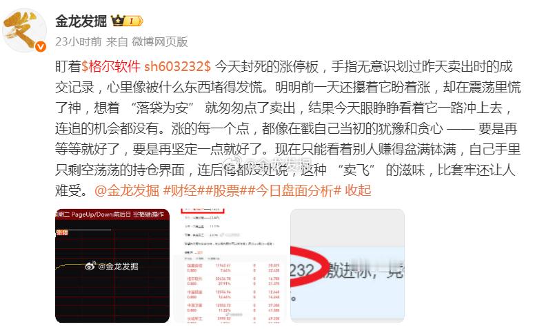 看着$格尔软件 sh603232$ 和$中国卫星 sh600118$ 今天的大涨,真是大腿都拍断!前两天明明拿着,就因为小赚了一点,又担心回调,纠结半天还是卖了。现在眼睁睁看着它们一路冲高,当初的犹豫全变成了后悔,肠子都快悔青了。早知道再拿一拿,也不至于错过这波行情,真是应了那句 “卖飞的票永远在涨”,这心情谁懂啊!