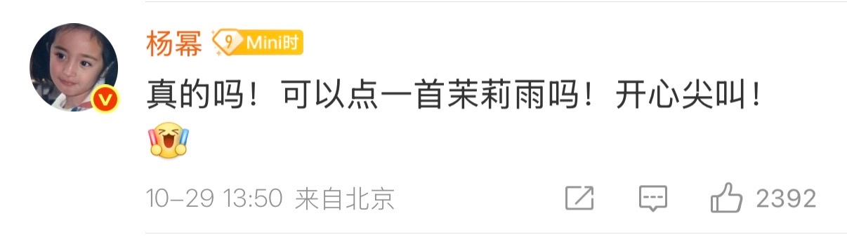 【林俊杰杨幂下次台上一起唱】杨幂想和林俊杰合唱茉莉雨杨幂工作室分享其参加活动时在后台清场《一千年以后》,原唱林俊杰回复:好听!下次台上一起唱~杨幂在线点歌《茉莉雨》。很急,请两位尽快落实!!