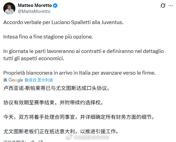 意大利名记莫雷托:前罗马、国米、那不勒斯、意大利国家队主帅卢西亚诺-斯帕莱蒂,已经与尤文图斯就执教一事达成初步协议。
