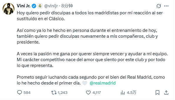 虎扑10月29日讯今天,皇马前锋维尼修斯更新个人社媒,就国家德比中不满被换下的表现致歉。