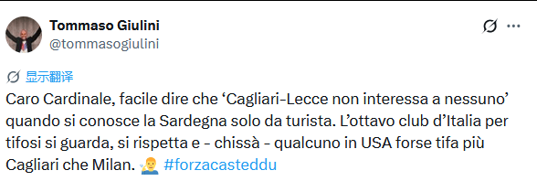 “卡利亚里是意大利球迷数量排名第八的俱乐部,他们同样能得到关注和尊重,谁知道呢,在美国,也许会有人更支持卡利亚里而不是AC米兰。”