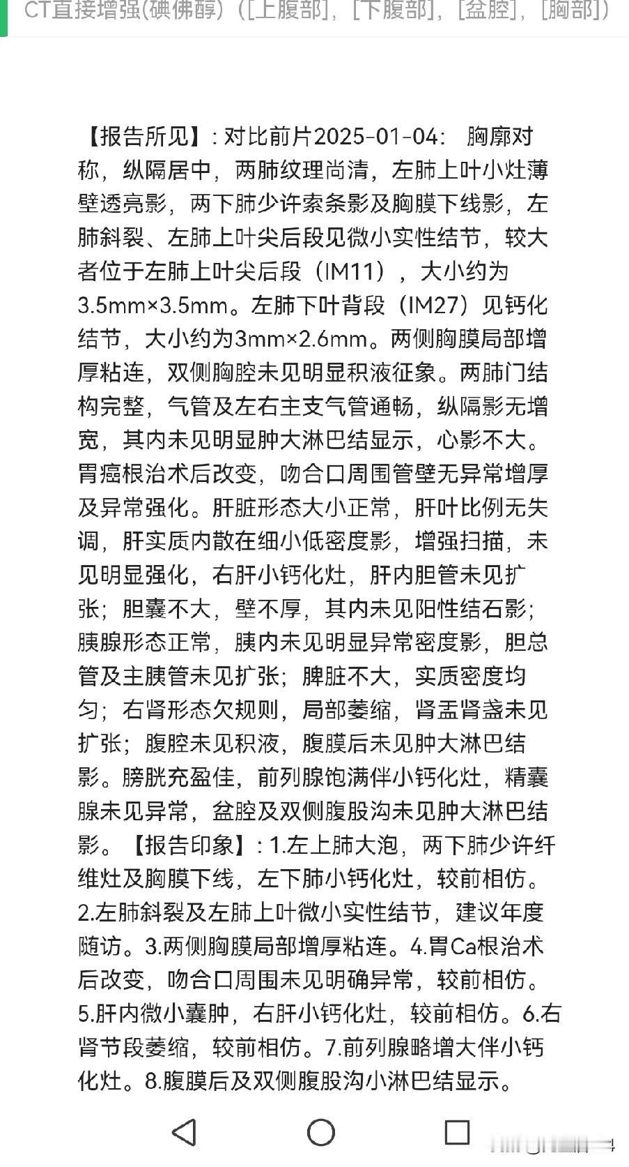 胃癌手术后又复查,第六次。 昨天去检查,还是检查老三样,除了血液,主要还是64排加强CT。说实话,每次的检查心里多少都有点忐忑不安的,比刚确诊胃癌时,心理负担大。 好在这次CT检查报告总体比上次还有好转,最担心的是第四次,那次糖类抗原比正常值稍微偏高,但主任说没事,有炎症的话,糖类抗原也会有所提高,三个月过后,再单独检查糖原,恢复正差值,真是自己吓自己。 按照主任的意思,明年还要检查两次,到第四年检查一次,第五年复查一次,如果没有问题。从医学角度上来说,就可以说是临床治愈。 综合这两年多的检查结果,和平时的饮食及胃肠道反应,还有身体其他感觉,包括休息睡觉,都没什么太大的状况,唯一还有就是吃硬点的饭,胃部有点涨,半夜三更偶尔有低血糖,所以要起夜吃点东西,体重也有所增加,所以自我感觉良好。 朋友见面聚会时,还会调侃我什么时候开始喝酒[捂脸],酒这玩意,我这辈子是都不想再碰了,终归命值钱。 希望第五年赶快过去,一切安好,达到临床治愈! 加油,抗癌人!! [点亮平安灯][点亮平安灯][点亮平安灯][点亮平安灯] 胃癌 胃癌治疗 胃癌手术 胃癌预防 癌症