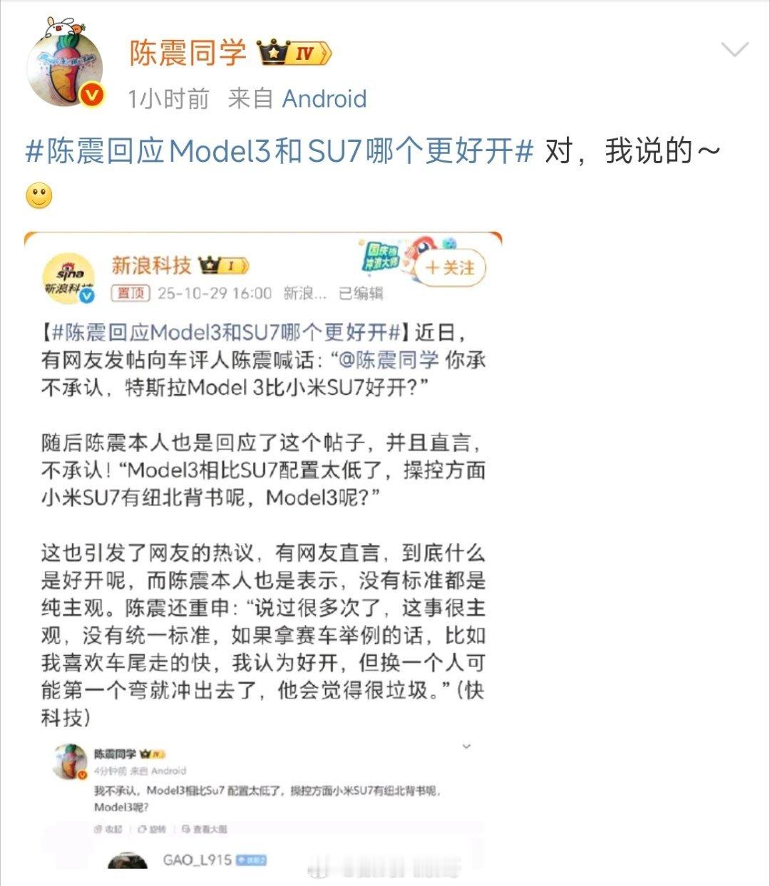 陈震回应Model3和SU7哪个更好开陈震回应引热议:不承认Model3好开,