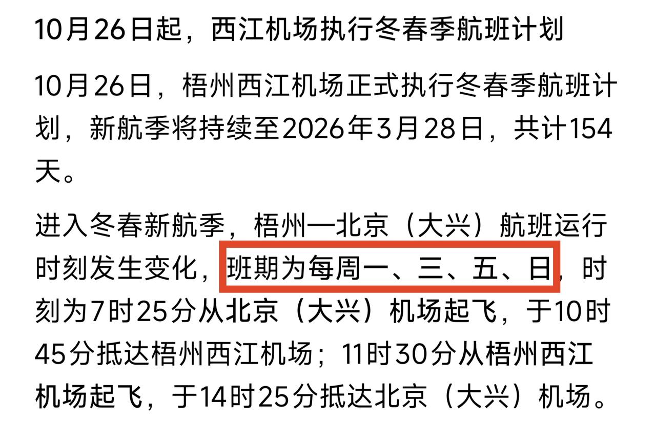 梧州最轻松的工作应该是在梧州西江机场上班了吧,前几年还有七八条航线,现在被砍到只有一条去北京大兴机场的了,而且每周才四个航班。 广西很多城市都有机场,但是小城市的机场越来越被边缘化,说真的,城区人口少于200万的城市,真的很难支撑起一个机场的客流,航班也少,还不如搭高铁到周边大城市搭飞机。