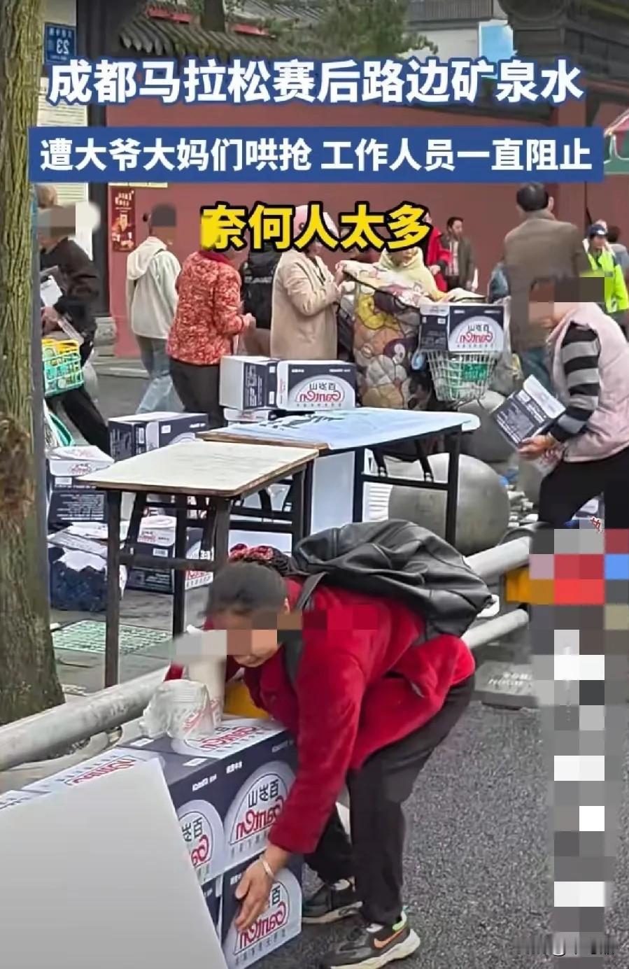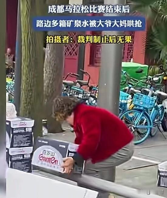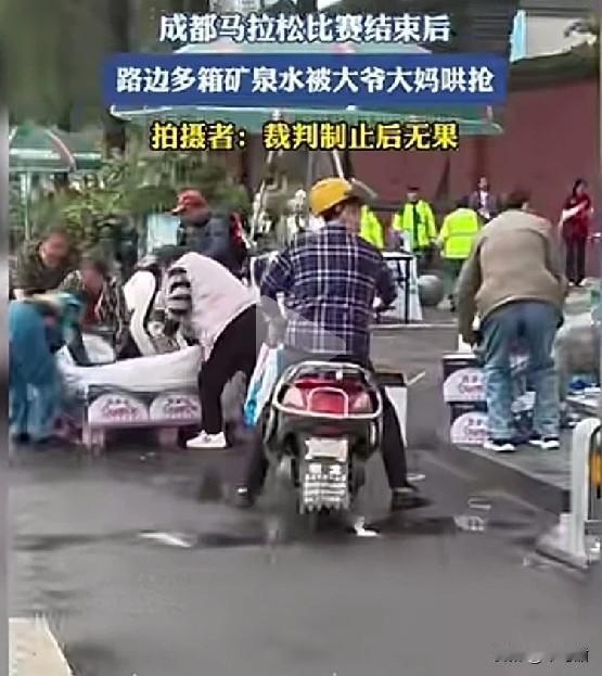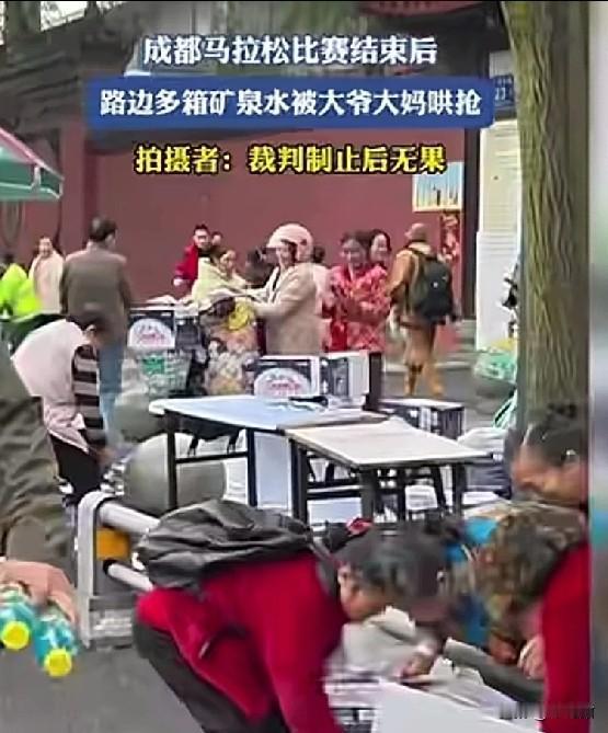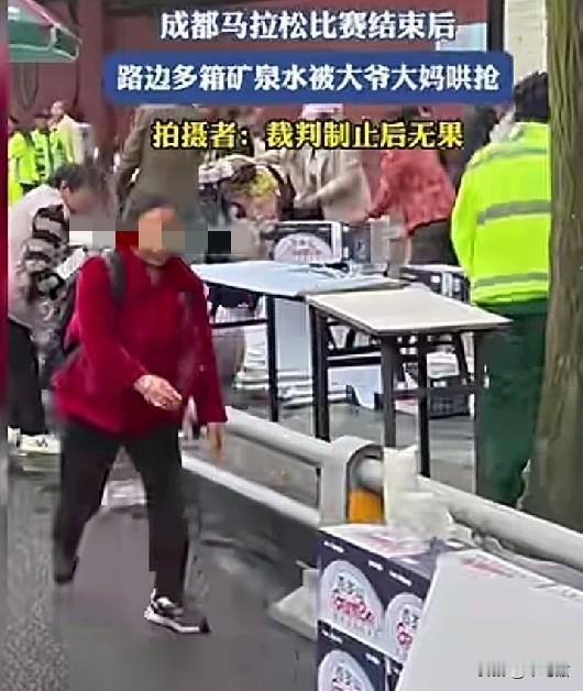 “兄弟姐妹们,冲鸭”,这不是为蒙牛赞助的成都马拉松选手鼓励加油,而是周边给参赛者准备的矿泉水,在号召大家快抢啊。 拦不住啊根本拦不住,工作人员都摆烂了,打电话给举办方,举办方也忙着收拾摊子去了吧,不接电话。于是就这么眼睁睁的看着市民自发组织的哄抢矿泉水。 别看平时挤个公交车虚弱的很,抡起不要钱的东西,那是麻溜的很,多名老年人直接抬起二箱就跑了,这还是我们看到的弱不禁风的中老年嘛? 很多人不知道,成都举办的这次马拉松意义在哪?甚至被本地市民吐糟,影响他们正常出行上班的交通了,以至于最后一名选手还直接被交警劝退了。 好吧,马拉松结束了,这矿泉水也抢的差不多了,圆满结束。 (图片来自网络视频)