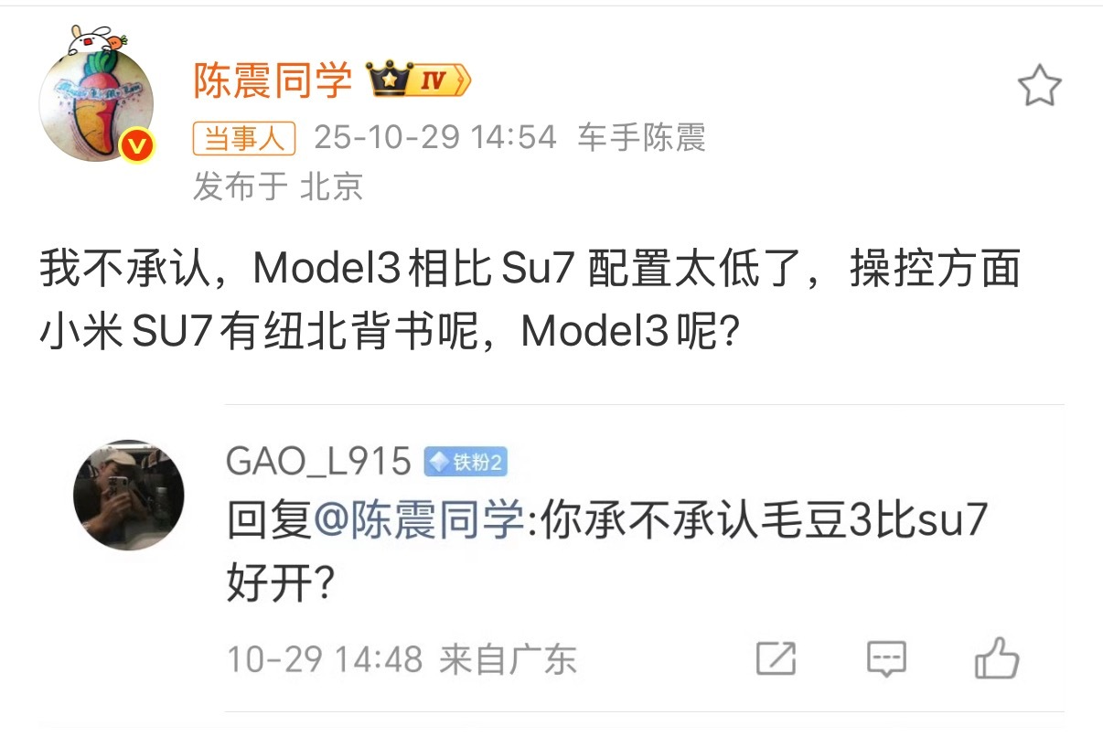 陈震回应Model3和SU7哪个更好开震哥果然顶流,一个简单的回复,直接热~搜第二。[good]
