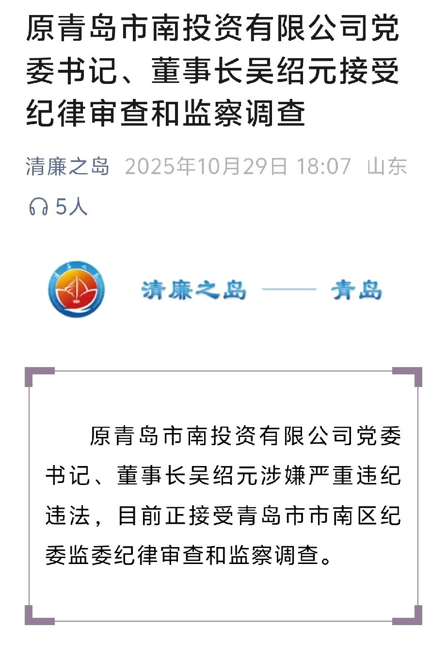 原青岛市南投资有限公司党委书记、董事长吴绍元涉嫌严重违纪违法,目前正接受青岛市市南区纪委监委纪律审查和监察调查。 市南投资有限公司2007年就成立了,是市南区政府第一家直属的国企。平时干的都是跟老百姓生活息息相关的事,比如城区里的基础设施建设、旧楼整修,还有土地开发、房屋租赁这些活儿。国企负责人手里的权力可不小,管着巨额资金和重大项目,一步走歪就容易出问题,莫伸手,伸手必被捉!