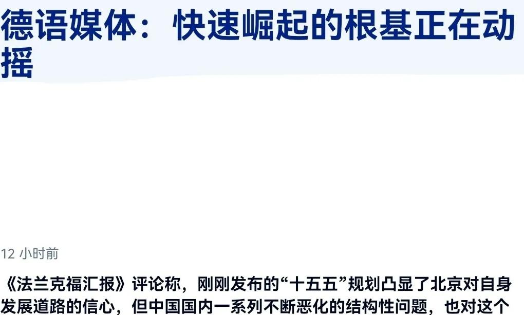 德国媒体10月29日消息说,虽然东方大国现在表现得非常强大,也变得更加强硬,但无疑根基正在动摇。 德国媒体强调,国内出现的结构化问题,正对他们造成了重大挑战,尽管他们的发展信心十足,但快速发展的代价已经出现,债务问题,产能过剩等等,都是现实问题。 事实上,可以看出,德国这是出来唱衰了,这是想通过这种方式,表达他们的另一种不满情绪,为自己找一个情绪的出口和心理的平衡。 只是,这样的说法有什么用?德国自己的问题很严重,德国自己知道吗?现在德国经济下滑,德国制造业在全球的优势已经没多少了。今年以来,就连德国大众都在国内关闭多家工厂,裁员数万人。这背后造成的,是德国经济下滑,就业严重不足等等。对此,德国有办法吗? 所以,这样的说法,只能说德国媒体也是想找找内心的平衡罢了。