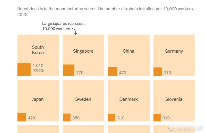 美国工厂每 10,000 名制造业工人平均使用近 300 台机器人,而中国为 470 台,韩国约为 1,010 台,位居世界第一。