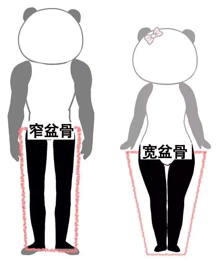 2. 男性骨盆小:女性由于生育原因,天生骨盆结构偏大,再配上娇小的体型,从视觉上来讲,腿就会显得较粗;男性一般都是缩窄的漏斗型的小骨盆,他们的骨盆腔比较高窄、紧凑,顺着长下来的腿就容易显得“细、长、直”。