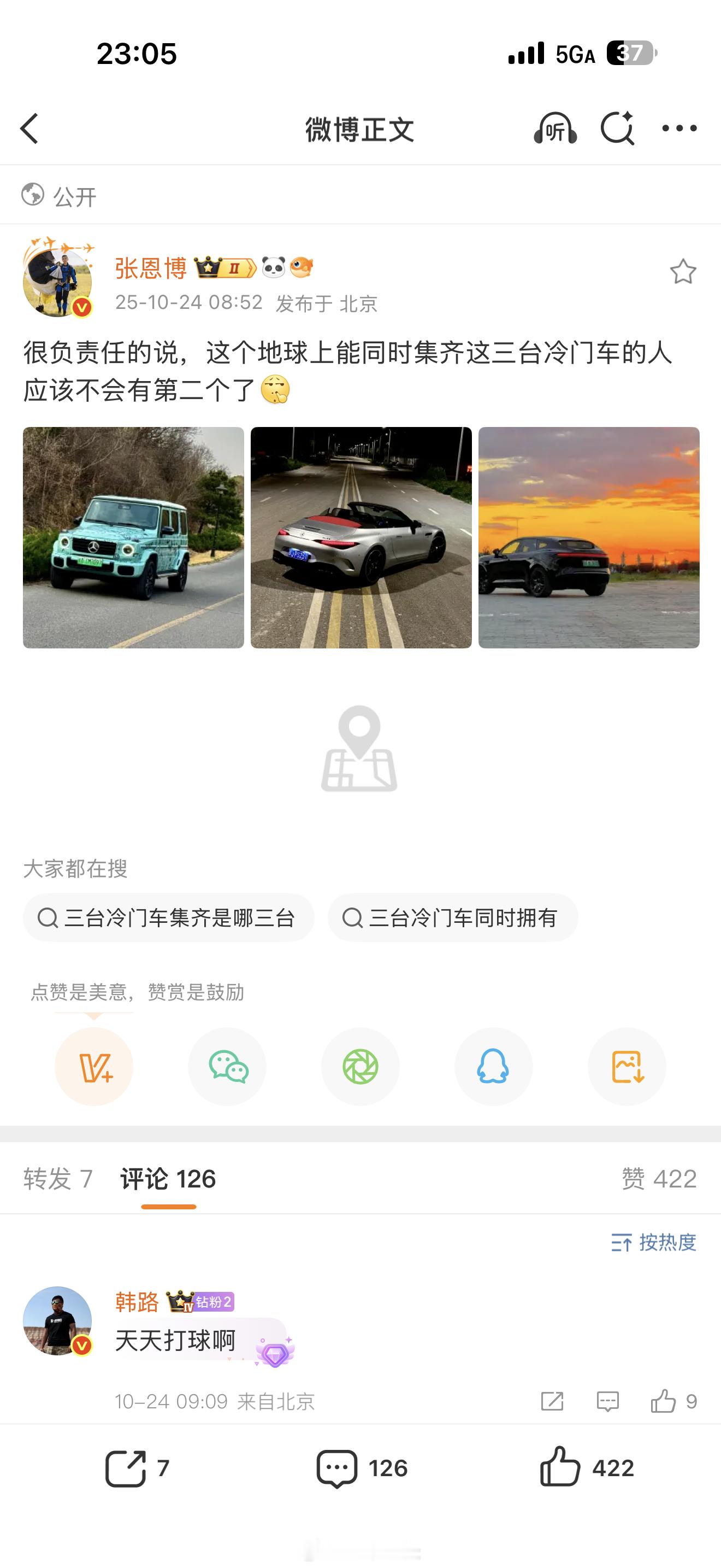 而最近的思考是集齐了电动大G、SL63、阿维塔011很难得[微笑][微笑]