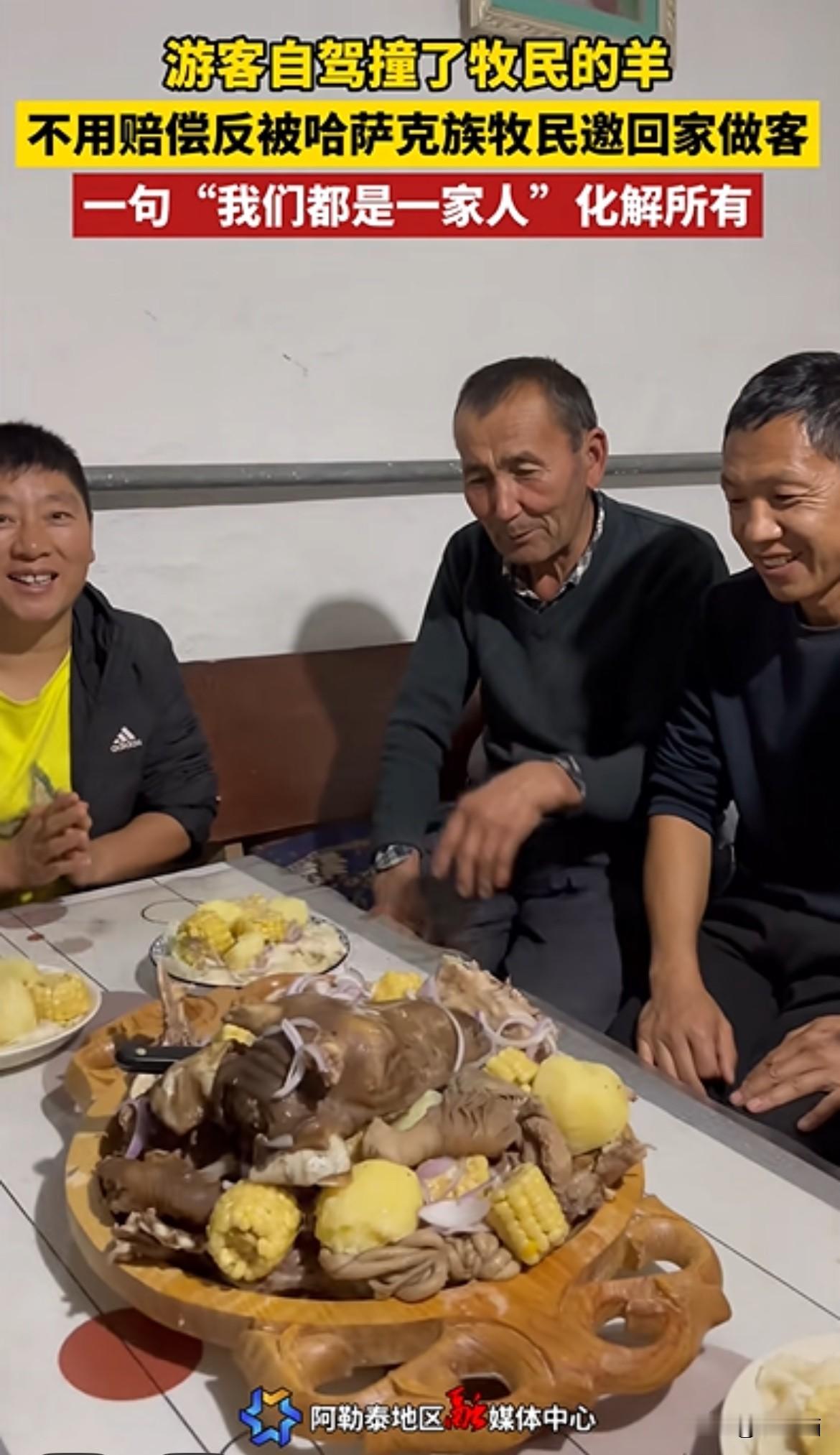 自驾撞了牧民的羊, 没赔钱反而被请吃了顿饭? 这波操作真的戳中人心! 谁都知道在阿勒泰,一只羊对牧民来说是实实在在的收入,2023年当地畜牧业产值占农业总产值快一半了,丢只羊可不是小事。换别处可能得纠结赔偿金额,但牧民赛力克却把博主当客人,领回家宰羊做饭招待。 这份不带功利的善意是最打动人心的!