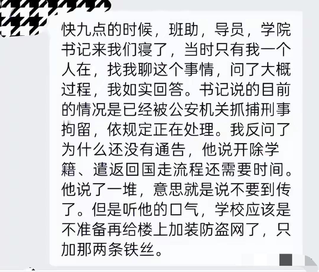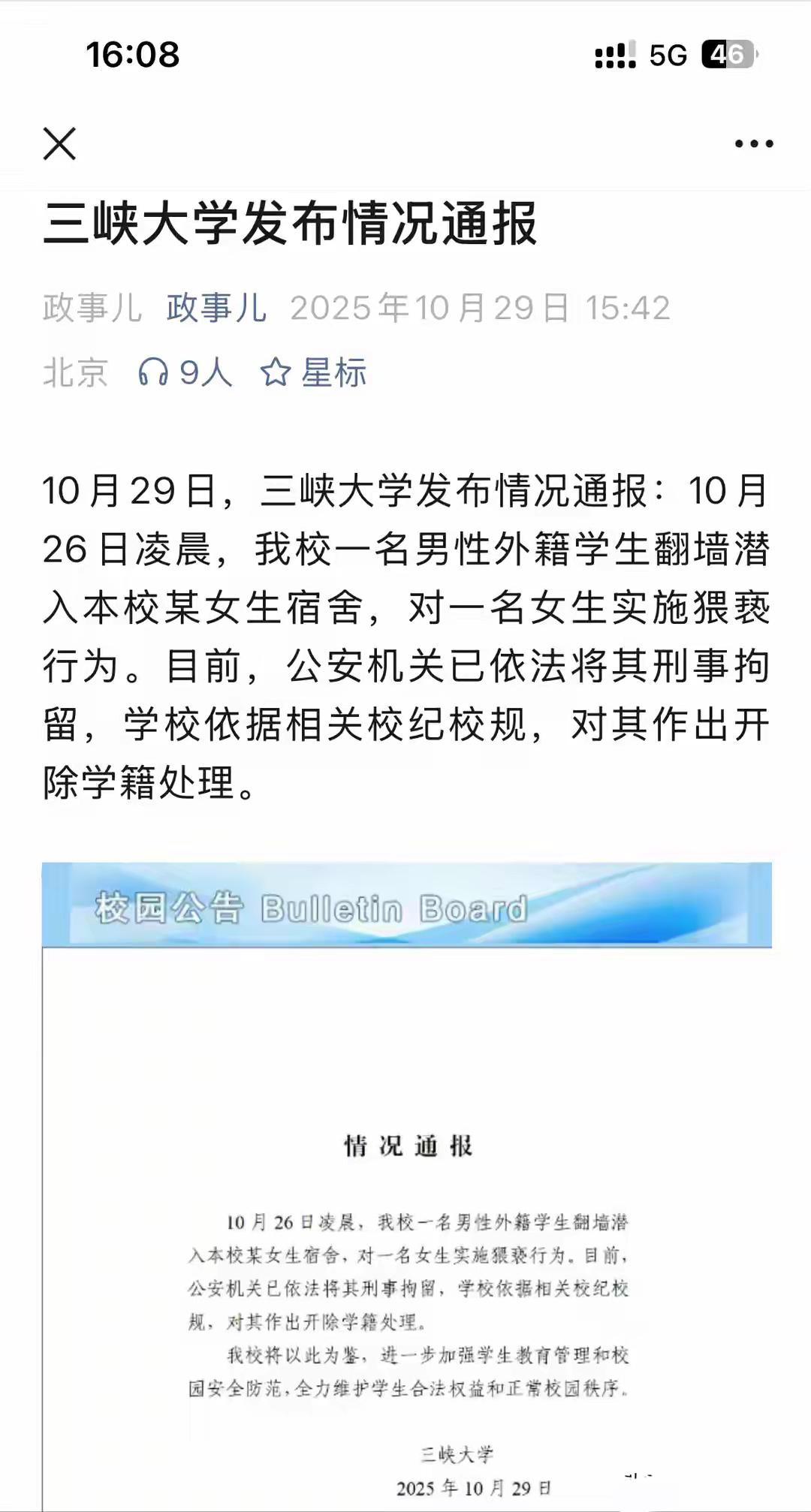 三峡大学这下出名了。 深夜,女生宿舍楼被一个印度三哥留学生爬了进去,对一女生实施猥亵。 三哥的疯狂超过想象。 …… 学校的从速从快处理值得点赞,但严控消息耐人寻味。