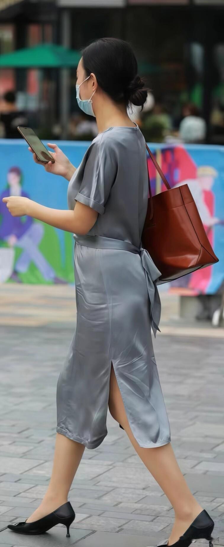 她身着灰色缎面连衣裙,搭配黑色高跟鞋与棕色手袋,简约优雅,尽显职场干练气质,是街头的一抹知性风景。