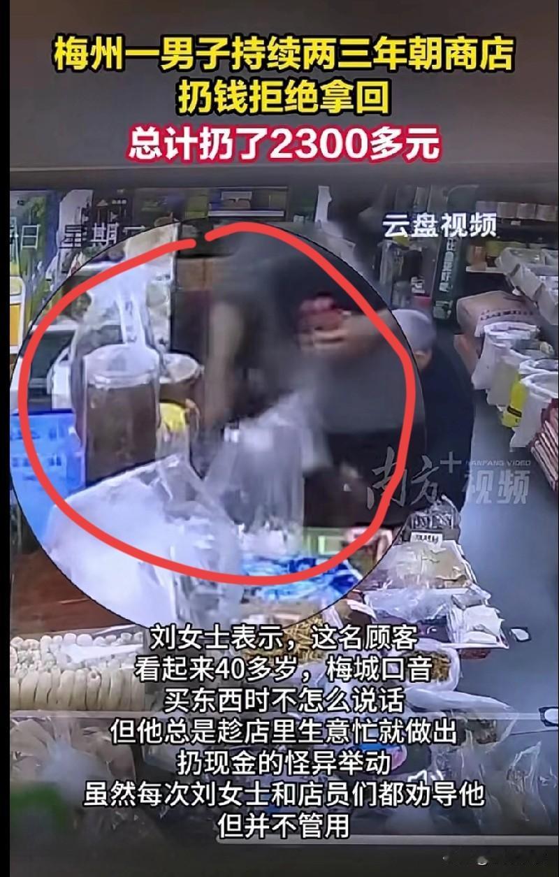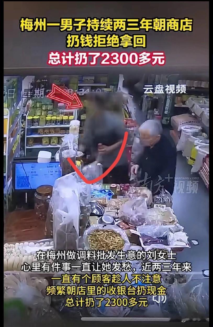 真没想到,还有白白上门送钱的!梅州的一位男子持续两三年朝商店的收银台扔钱,他趁人不注意就扔钱,有1元、10元的,甚至还有100元的,被发现了,男子还拒绝拿回钱,这几年男子总共扔了2300多元。 这名扔钱的男顾客有40多岁,是梅城口音,买东西时也不说话,但是他却总是趁着店里生意忙时,没人注意时,他往收银台扔现金,老板和店员们都劝他不要这样做,但是并不起作用,而且男子还拒不承认钱是他扔的,并且男子立马把钱送回来。店主希望找到男子的家人,以把这些钱送回去。 这上门送钱看上去感觉是好事,但是怎么透露着诡异呢,有点莫名其妙,他为啥他频繁的给商店扔钱?还给他,而他还不要呢?这到底是怎么回事呢? 这商店的收银台又不是许愿池,扔钱是干什么啊? 有的网友说,这个男子要不就是精神病,要不就是这里有啥说道。 我真没见过这种人!