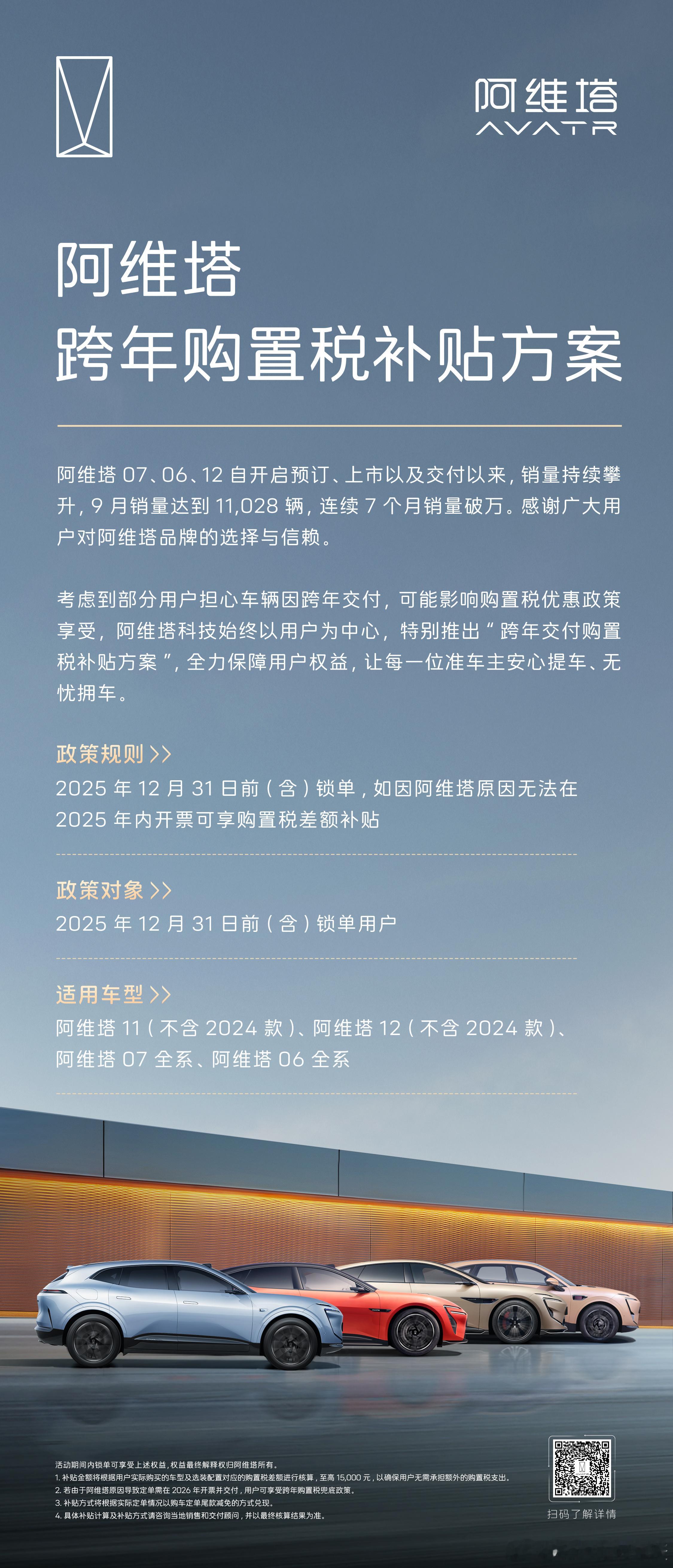 阿维塔跨年购置税补贴方案发布 阿维塔跨年购置税补贴方案出炉,2025年12月31日前(含)完成锁单,若因阿维塔原因需在2026年交付的用户可享受跨年购置税兜底政策。