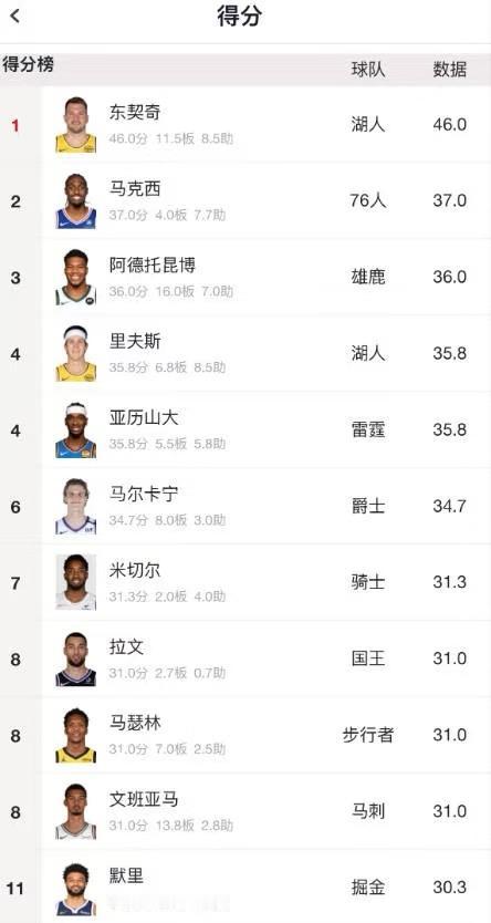 目前NBA的场均得分榜,真是爆炸了! 本赛季,真的是爆炸的一个赛季,场均得分是真高啊!不过去年开场其实也差不多,动不动40+50+,但最后也就两个人超过30分,过一个月就下来了,刚开打大家都有劲。