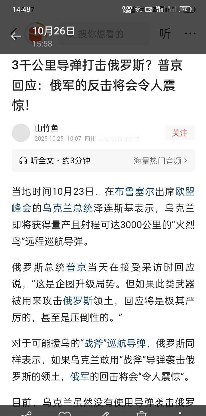 泽连斯基亲口说乌方已用射程3000公里的“火烈鸟”“鲁塔”导弹攻击了俄罗斯,这事不是小道消息。 他说得时候表情有点松弛,语气还挺平静?像是在说明一个早就计划事。可是他没讲具体打了哪儿,哪些目标挨了炸,也一言不发。到底是哪块地方?莫斯科还是别的战略点? 乌方新导弹今年还得继续用,这意思,就是往俄罗斯后院扔石头不会停。表面看起来挺有底气,但也可能是心理战,谁信啊?! 他吹嘘导弹性能“优异”这俩字,卡在心头挺久,有点像把技术优势挂在旗帜上也许,未必全都是实打实的事。俄方有自家侦测系统,去年远程精确打击记录,俄媒体俄新社还专门反复报导,打了俄油库、通信站,当时用的是更短程的设备,谁知道这回3000公里是哪种力度? 普京早在10月下旬就摆明了态度。他直接说如果这类武器攻击俄境内,俄罗斯回应会“极其严厉甚至压倒性”。这话放出来不是在空喊口号。这一层,俄军有大量的反制方案,据乌方自己披露的无人机雷达探测数据,今年前九个月,俄方拦截率超过88%,还是权威军事独立机构出具的检测报告。 现在等什么?这笔账还没落地。泽连斯基话语背后的逻辑跳来跳去,说是勇气,其实也暗藏一些更复杂博弈。真要引发大规模升级,欧洲安全局势还得再掂量一下,美国防部最新的投入数字也没松口,弹药运输限制得很死。 有意思的一点,乌克兰和俄罗斯同时加速军备研发,北约多少都在旁边观望不出手,这场戏硬是被拖长了,有点像手里握着牌却还没摊出来。而谁先动大棋?谁就会在下场时露底牌,还是普京说的算吗?有人觉得普京会出狠手,也有人说事情可能没那么简单,谁又真能看懂全部? 如果不是泽连斯基亮了底牌,俄方未必会那么快动真格。又或者,现在只是刚刚摆了个开端。推演到这步,也许就该看接下来俄罗斯的出牌方式了。 一招棋下去,谁笑到最后?也不好但乌克兰这步算是给复杂局势添了把火。 到底会不会有令世界震动的回应,现在还不好讲,结局全因为彼此手里的底牌。