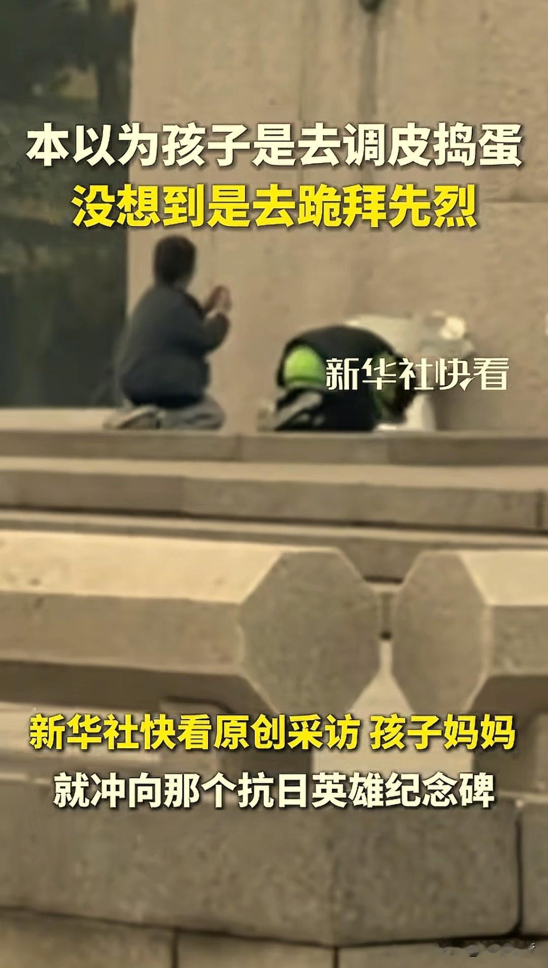 “让人欣慰!”北京,一女子带两个孩子在烈士陵园游玩,期间两个孩子突然挣脱女子的手,冲向了烈士纪念碑,女子本以为孩子调皮捣蛋刚要去追,结果突然愣住,两个孩子跑过去竟然做出了让人意想不到的一幕。 少年强则国强!有这样的孩子祖国必强大! 视频中,两个孩子跑上纪念碑台阶后,一把扔掉了头上的帽子,没有任何犹豫的跪在高大的纪念碑前,双手合十后,虔诚的磕了三个头,结束后,缓缓起身,才捡起了身后的帽子。 这一幕被身后的妈妈记录了下来,倍感欣慰。她从未想过,调皮捣蛋的孩子们,在这件事上会如此懂事,那份对于先烈的崇敬像不比任何大人差。 女子随手将视频发到了网上,还解释称她从未教过孩子这样做,但她们是卢沟桥的人,也许是从小熏陶过,在这一刻突然具象化了。 有网友感动:看到孩子跪拜的那一刻,真是让人突然间就再也绷不住了! 也有网友说:这说明学校和家庭在这方面的教育是成功的,在他们幼小的心灵里种下了崇尚英雄的种子! 这俩孩子,跪下去的是对先烈的感恩和崇拜,是民族的希望。 爱国和敬仰从来不需要刻意去教,它就藏在先烈们保家卫国的故事里和父母老师言传身教中。 看到这样的下一代,相信祖国的未来会更加辉煌,英雄的精神会一直流传下去! (来源:新华社快看)