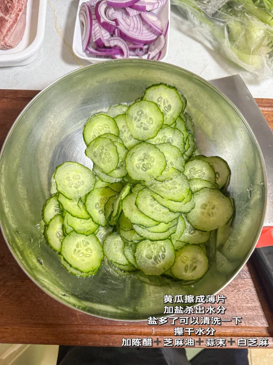 1️⃣ 黄瓜擦薄片加盐杀水(盐多可冲洗)