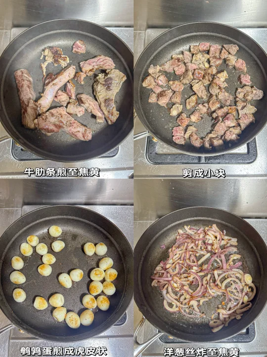 1️⃣ 牛肋条煎至焦黄,剪小块,鹌鹑蛋煎虎皮