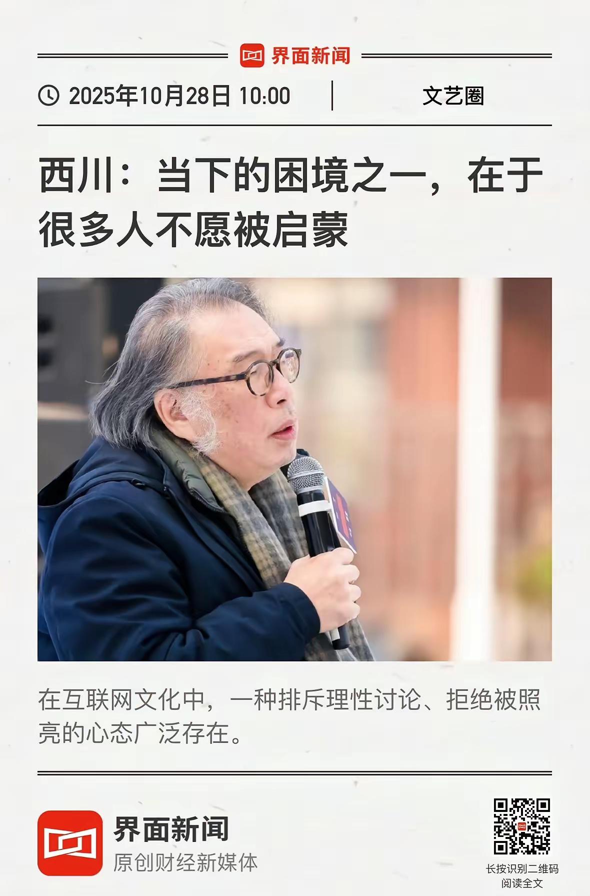 诗人西川一句“很多人不愿意被启蒙”,直接在网上引来了群嘲,这话听着真让人纳闷——现在的中国,还需要文人来“启蒙”吗? 早年见过西川几次,数零钱、弹口香糖的样子挺可爱,可没想到一把年纪了,还抱着老一套的想法不放。所谓的“启蒙”,搁以前不就是搬些外国概念,变相PUA中国人吗?真按那套来,中国哪有今天的强大。 我自己就是文学圈出来的,早就想过:我们这些搞文字的,要是脱离现实、跟不上时代,连中国的发展成就都看不见,凭啥觉得能指导别人?知识分子该做时代的旁观者和支持者,而非站在中华文明对立面指手画脚。 真正的清醒,是认清自己的位置,为中国的进步喝彩,而不是抱着过时的优越感自嗨。你觉得现在还需要所谓的“文人启蒙”吗?来评论区聊聊你的看法~