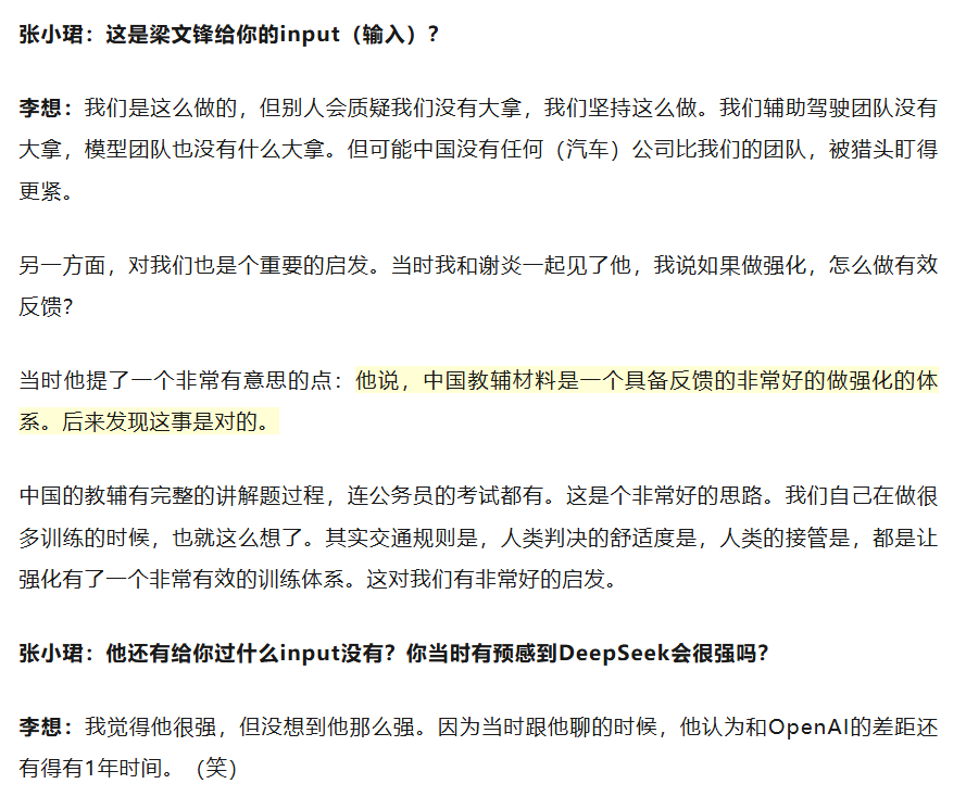 DeepSeek梁文锋给了李想两点input。