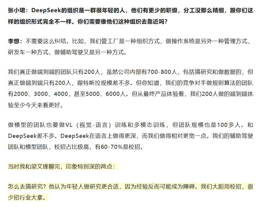一是年轻人做研究更合适,经验反而成为障碍。所以理想大胆用校招,很少招行业大拿。