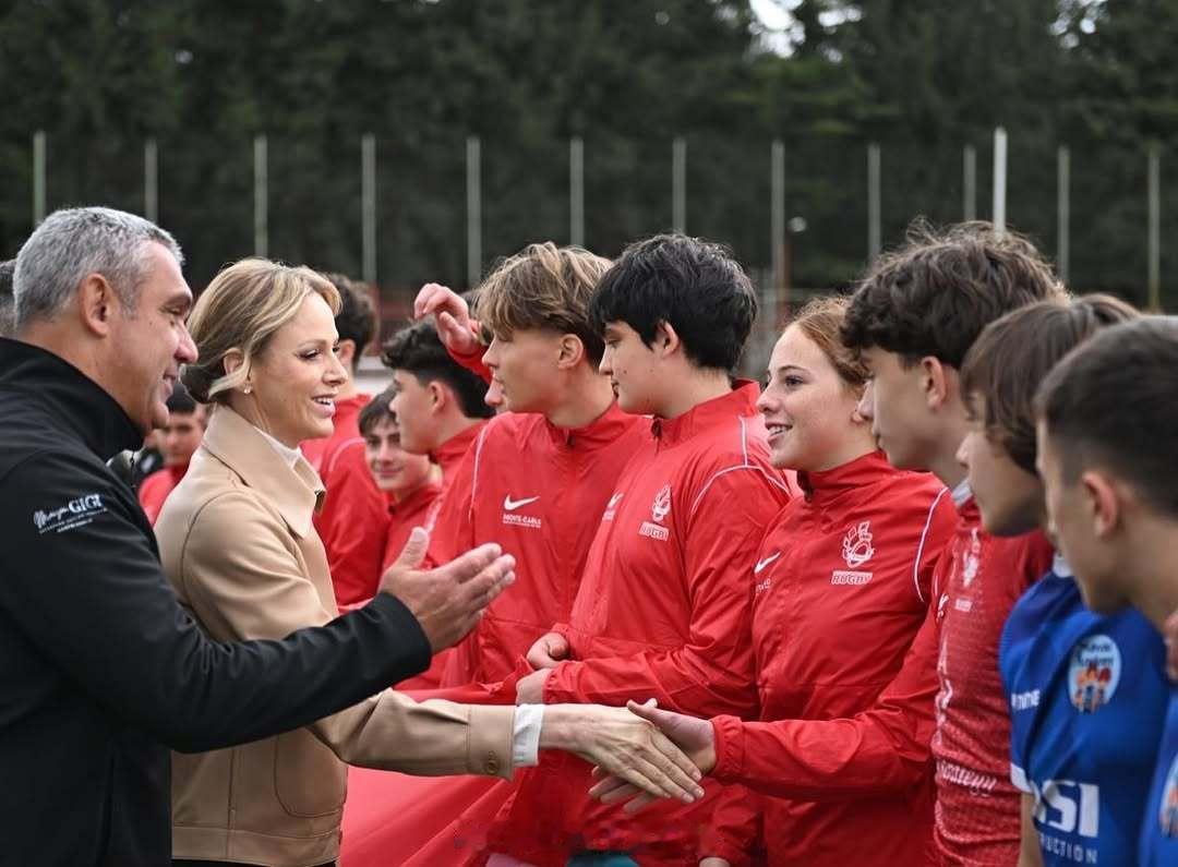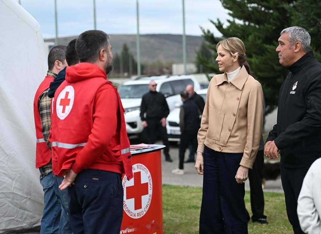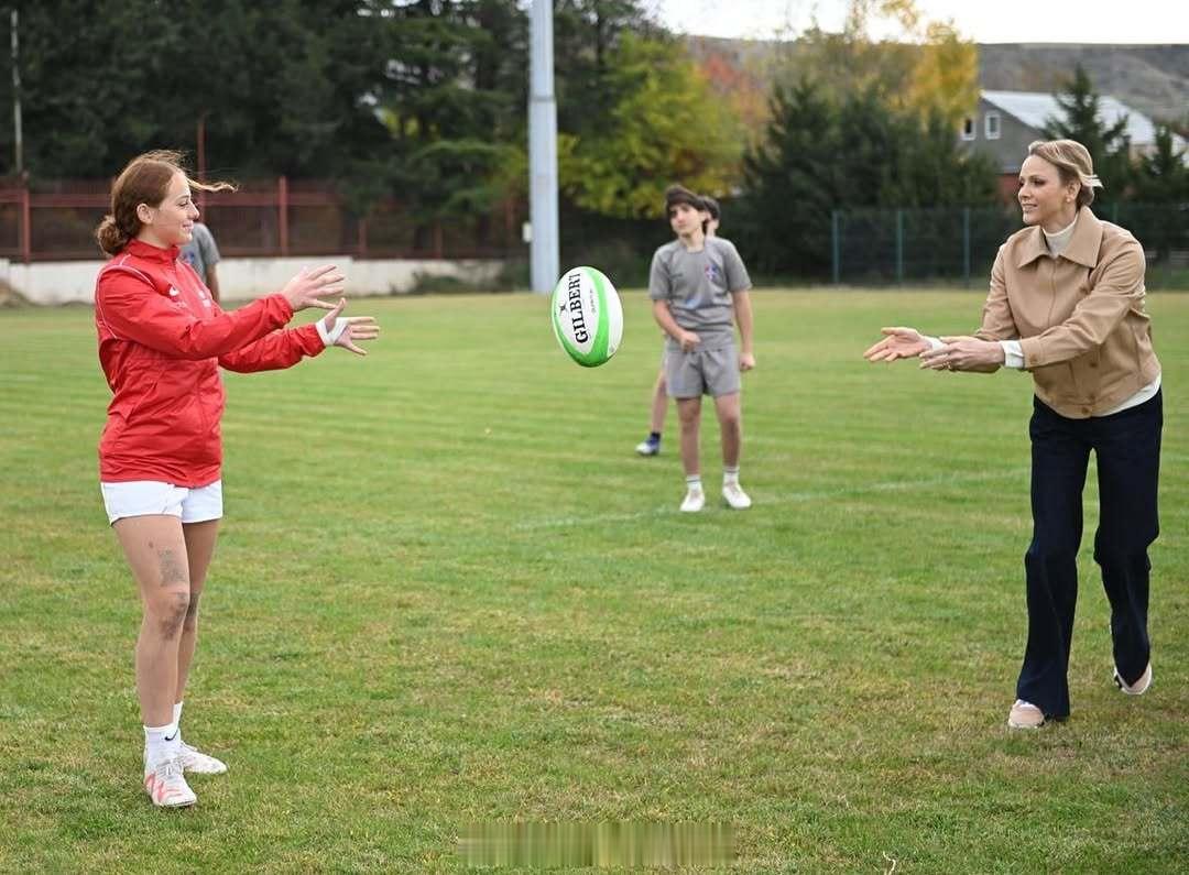 10.29 摩纳哥王妃夏琳在格鲁吉亚探望集训ing的摩纳哥u16橄榄球队,皮夹克来自ARNO