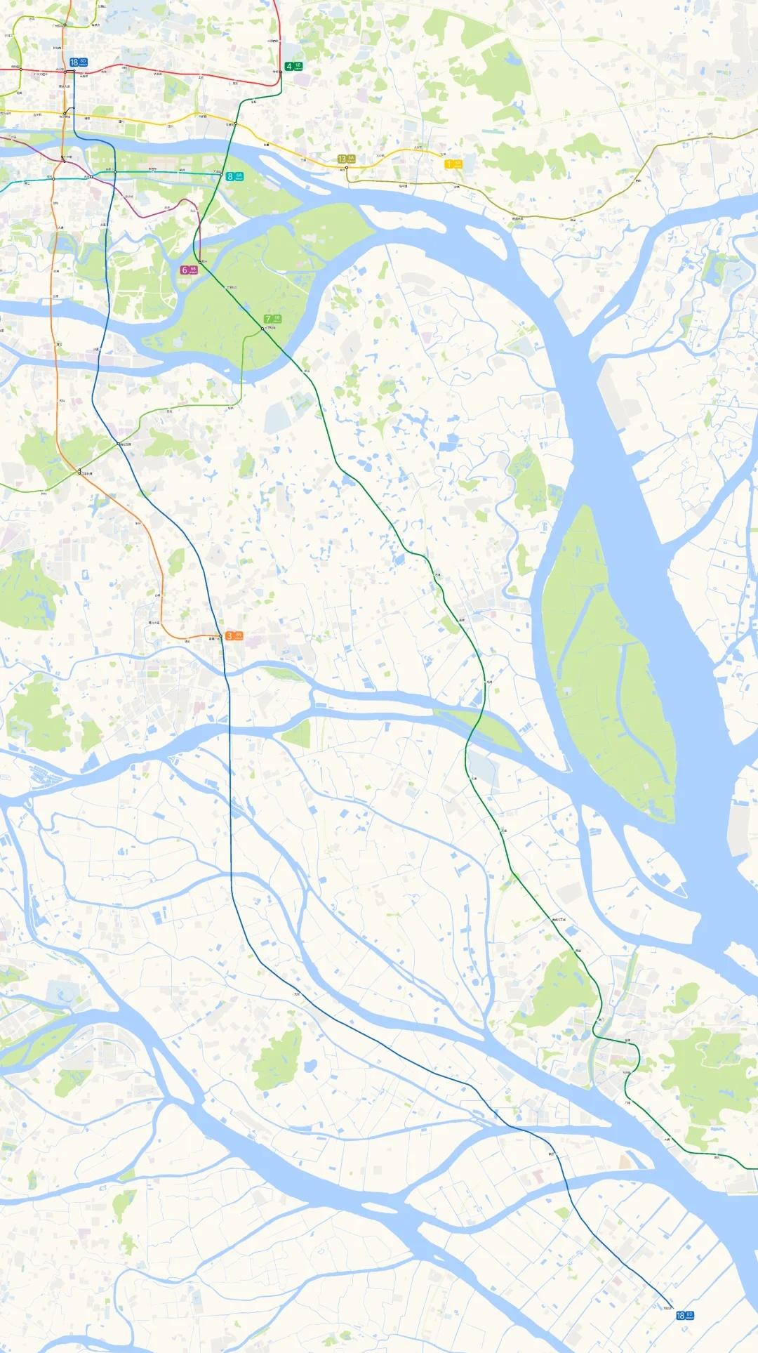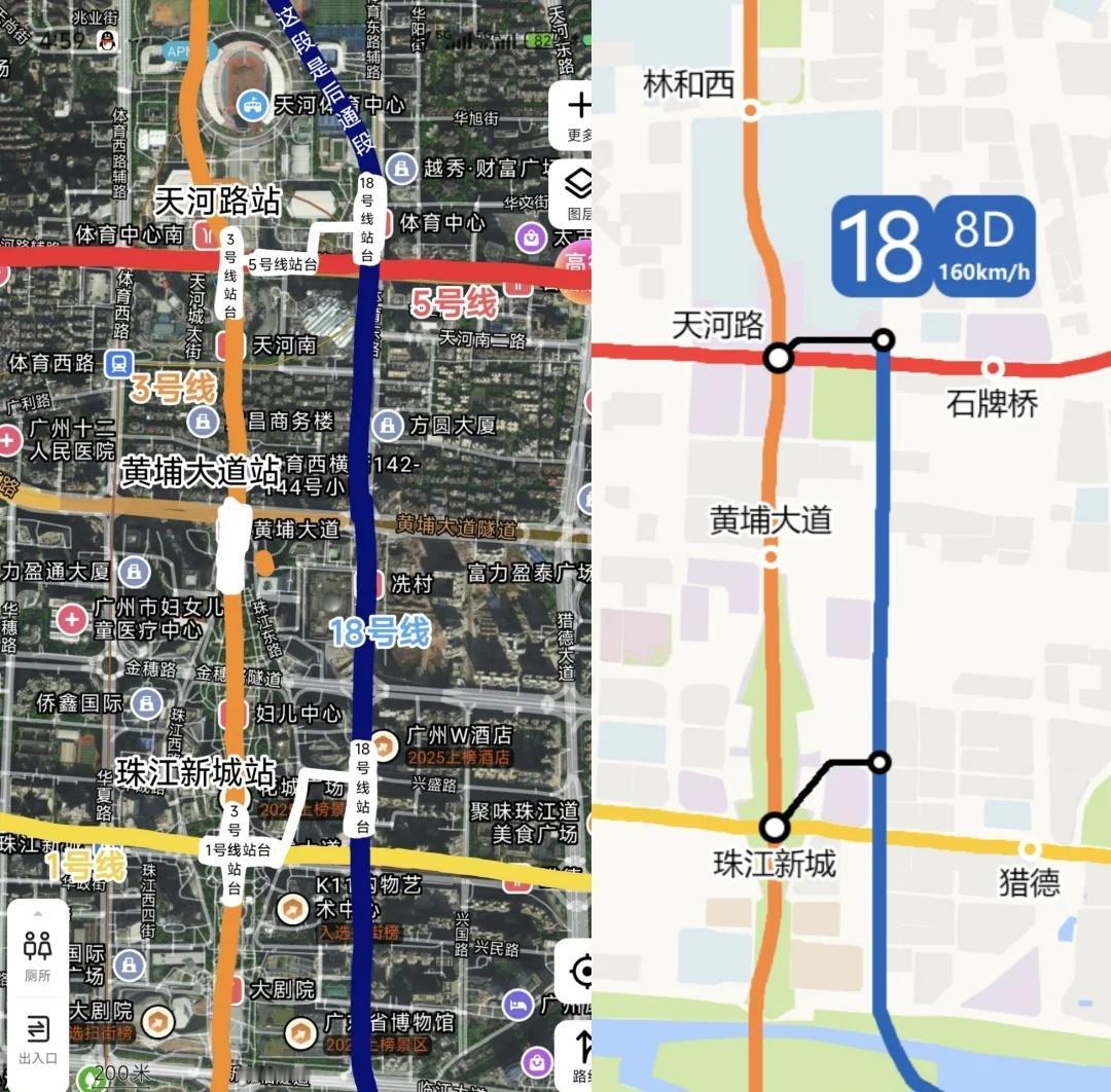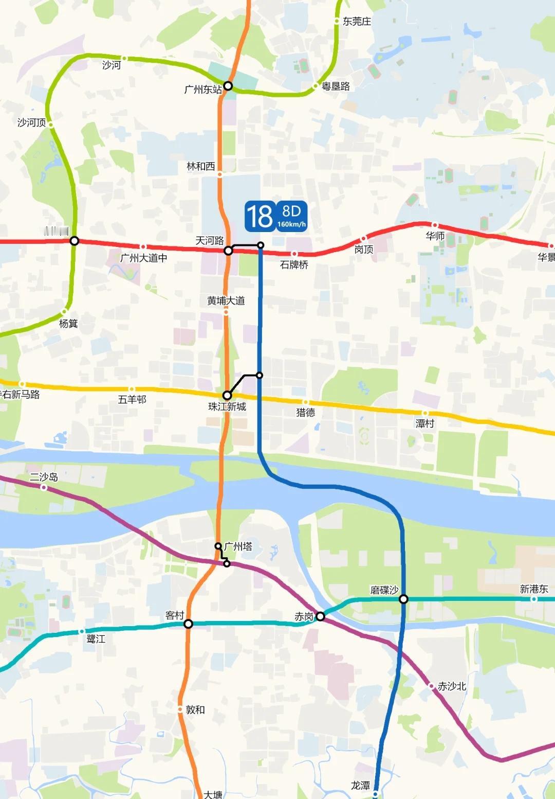 如果18号线增加更多换乘站 如图是该架空2021年底的线网图。18号线和现实中同一时间开通,但是首通段将冼村站改为天河路、珠江新城两个站,分别是3-5-18的三线换乘站和1-3-18的三线换乘站,增强18号线分流3号线的能力。 现实中18号线首通段天天运椅子的原因很大一部分是在就业密集区珠江新城CBD只有一个冼村站,要想换乘其他线路很困难,难以承接市区线的客流,最多通过3号线在客村换乘8号线再在磨碟沙换乘18号线的方法连通,费时费力。 新广九方案将3号线从华夏路-体育西路东移至花城广场正下方(现实中APM线的位置),使得3和18接近了很多,可以建设换乘通道。其中天河路站5换18要走约300米,珠江新城站1换18要走约400米。虽然距离较远,但总归是提供了换乘的可行性。后通段修到广州东站时,换乘便利程度将会大大提高。 提高客流的另一个方法是在人口众多的大岗镇设站。现实中18号线由广珠路改走南沙大道,导致大岗镇痛失地铁。该方案将线位挪回广珠路,在大岗镇东侧设站。番禺广场-大岗的间距会比现实中的番禺广场-横沥间距短的多,只有16公里。 关于磨碟沙站。最初作者计划让18号线在赤岗和6、8换乘。然而赤岗站的位置难以对接后面的28号线。所以选择在设计老2号线时将磨碟沙站适量东移,使得2-8能够构成节点换乘。 城市交通规划