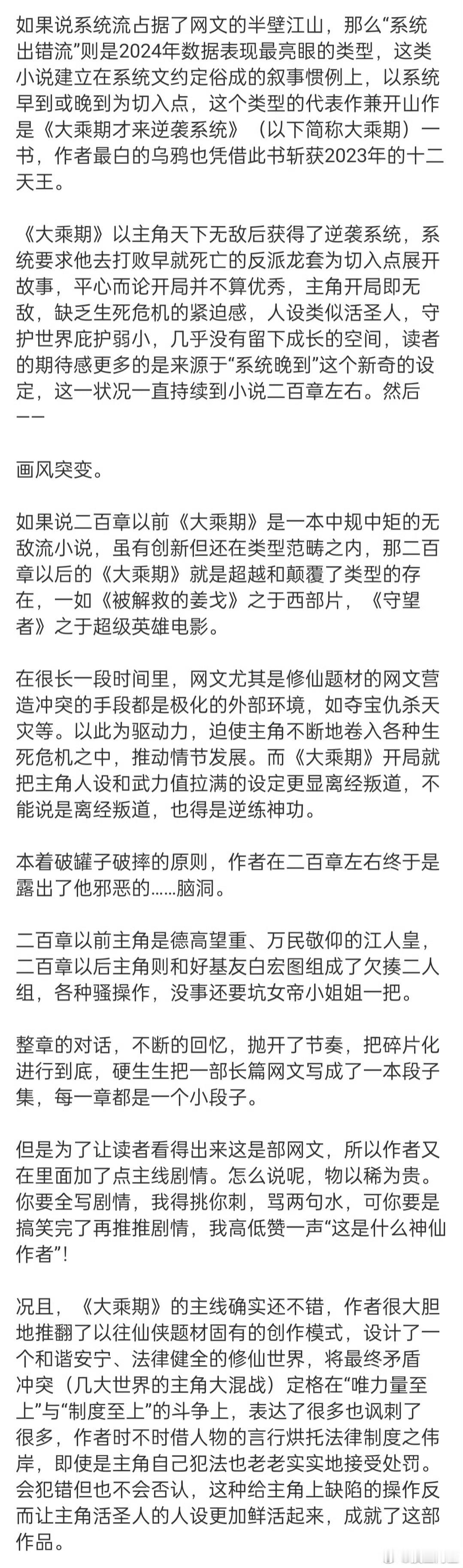 推《大乘期》这本书已经推了好几年了……真的很适合改编,因为它不是枯燥的升级流,而是有各种剧情的,非常适合改编成轻喜剧,仙侠版《武林外传》的感觉
