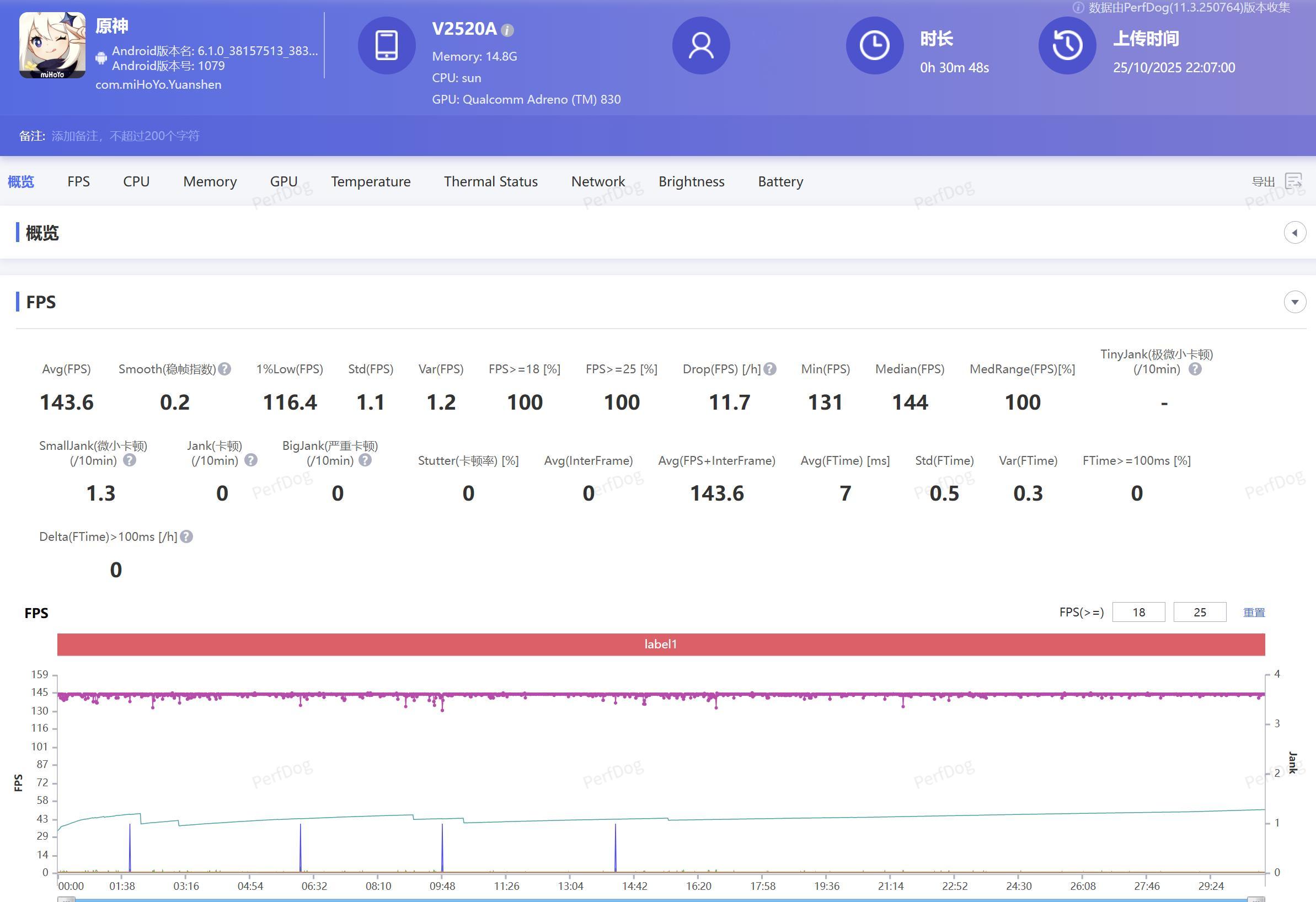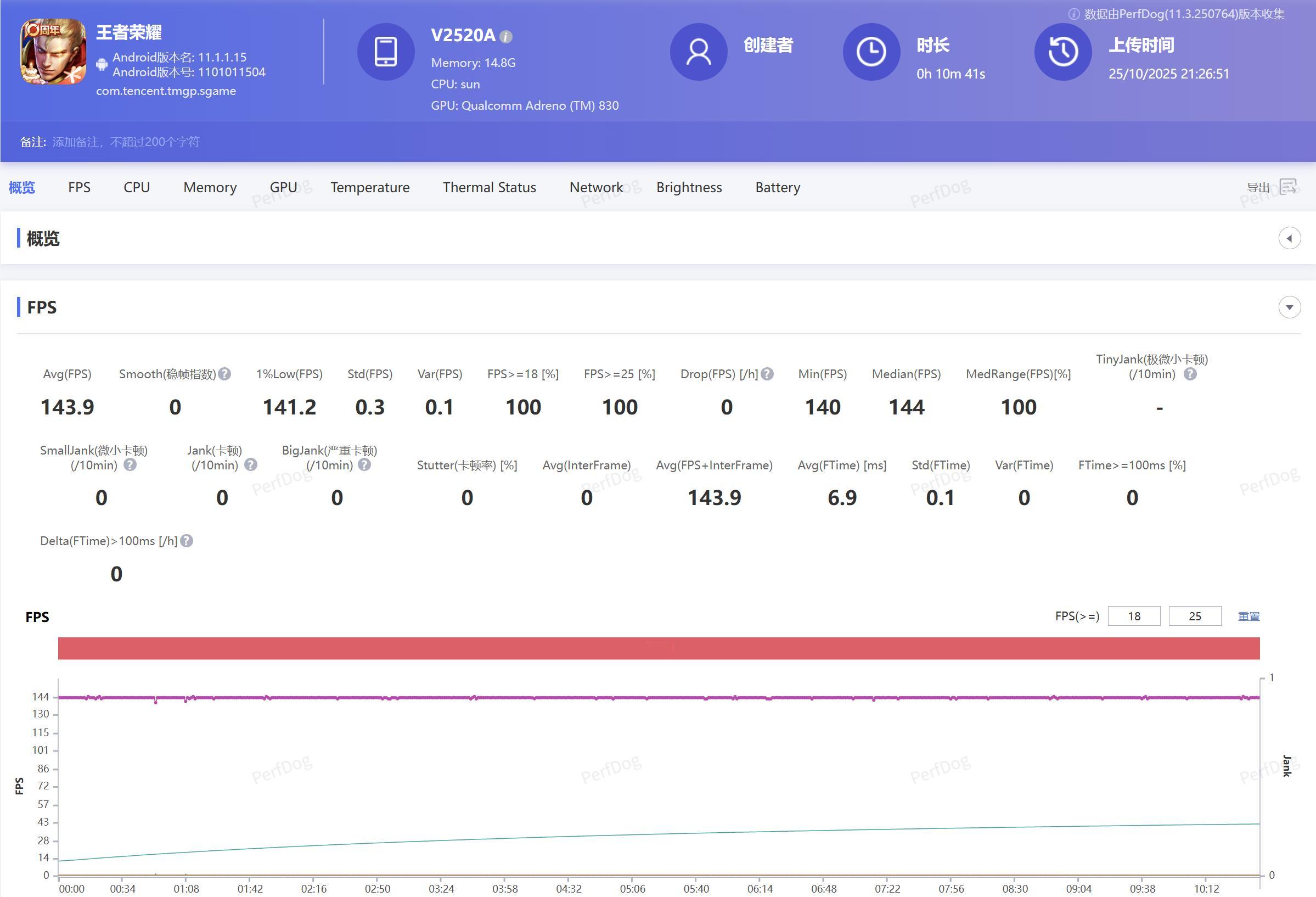 iQOO Neo11的游戏性能表现到底有多强,路飞也专门进行了游戏测试,并使用Perfdog软件对游戏帧率进行了记录。首先是国民手游王者荣耀,iQOO Neo11是支持144FPS极致帧率的,在超高分辨率的模式下,单局游戏的平均帧率达到了143.9帧,且1%low帧也达到惊人的141.2帧,整局游戏无论打怪还是团战都是在极致满帧的状态下进行。同时我还开启了4D振感模式,在技能的释放和击杀英雄时振动的手感反馈真的太爽了。