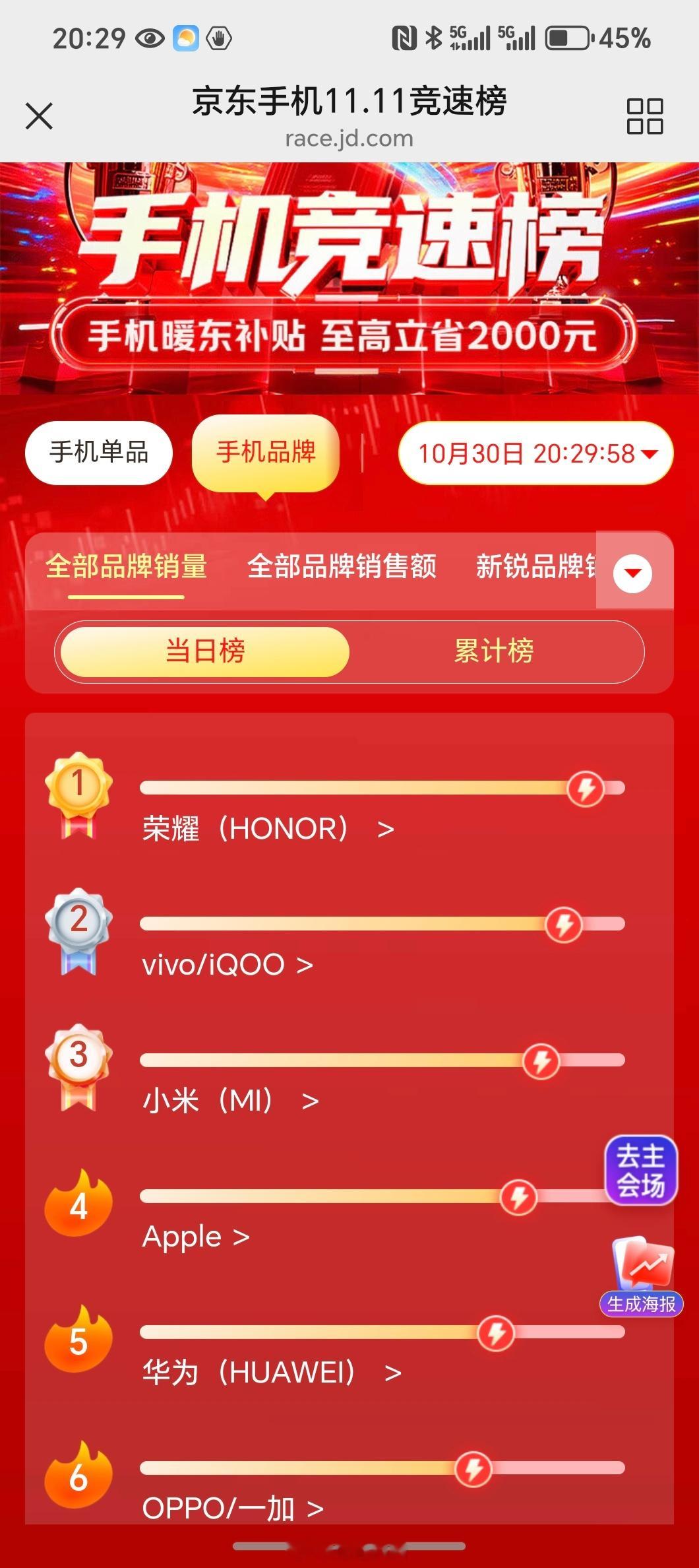京东双11晚8第一波,荣耀是京东手机竞速榜第一,荣耀X70和荣耀GT是单品销量榜第一第二