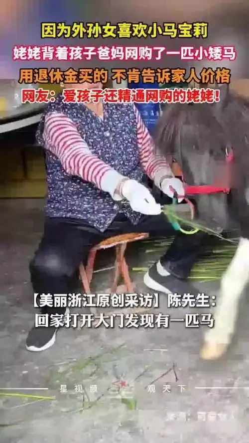 “千万别教老年人网购!” 山东陈先生的一句吐槽,却让无数人看湿了眼眶。前几天他接到丈母娘的电话去取快递,赶到楼下当场傻眼 —— 哪里是什么包裹,竟是一辆装着活马的货车,而这 “快递”,是丈母娘给 8 岁外孙女朵朵的礼物。 故事要从半个月前说起。朵朵跟着妈妈回姥姥家,看动画片时随口念叨:“奶奶,小马宝莉好可爱,能摸一摸就好啦。” 正在择菜的姥姥没接话,只是笑着摸了摸她的头。可转头,老人就戴上老花镜,拉着邻居家小姑娘帮自己搜 “小矮马”,一遍遍追问:“会不会咬人?小孩能骑吗?家养方便不?”。 选马的半个月里,姥姥比给自己买衣服还上心。特意加钱挑了温顺的 4 岁小马,身高才 70 厘米不会再长,还配齐了小马鞍和胡萝卜干。发货后天天盯着物流,货车到的前一晚,硬是把院子扫干净铺上新干草,说要给小马 “搭个舒服的窝”。 朵朵写作业时听见 “马到啦”,扔下笔就往外冲。看见棕黄色的小矮马甩着尾巴站在围栏里,比自己高不了多少,小姑娘一下子扑到姥姥怀里尖叫:“奶奶!是真的小矮马!” 现在每天放学,她第一件事就是喂小马吃胡萝卜,姥姥就坐在门口小板凳上看着,偶尔还帮着梳马毛。 后来陈先生才知道,这匹叫 “豆豆” 的小马花了五六万,而姥姥每月退休金才两千多。当女婿问起价格,老人只是笑眯眯地说:“别管钱,外孙女喜欢就行。” 这话让陈先生瞬间红了眼:“这就是最实在的隔代亲啊!”。 有人算过账:养小矮马每月饲料、修蹄、疫苗就得上千,还得有专属活动场地,可姥姥从没提过麻烦。就像网友说的:“我们总纠结玩具有没有教育意义,姥姥只在乎孩子笑不笑。” 这哪是送马,分明是把外孙女的 “随口一说”,变成了一辈子记得的童话。 你家老人曾为你做过什么暖心的事?评论区说说,让大家也沾沾这份宠爱