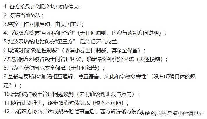 欧洲弄了一个乌克兰危机12点和平计划,我认为其中任何一条,俄罗斯都不会同意。按照欧洲这个所谓的和平计划,俄罗斯这3年就白打了。个人认为,哪怕是战胜国,也不能提出这些条件。真不知道欧洲人是脑子不好使,还是故意的。这哪里是和平计划,分明就是在挑衅俄罗斯。具体计划,大家可以看看,你觉得合理吗?