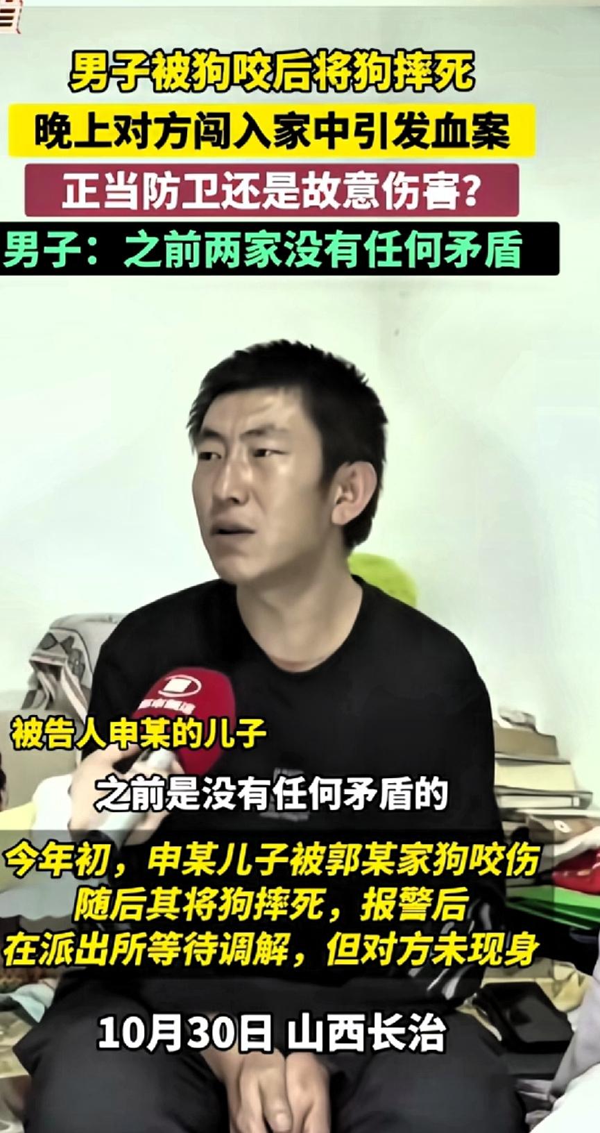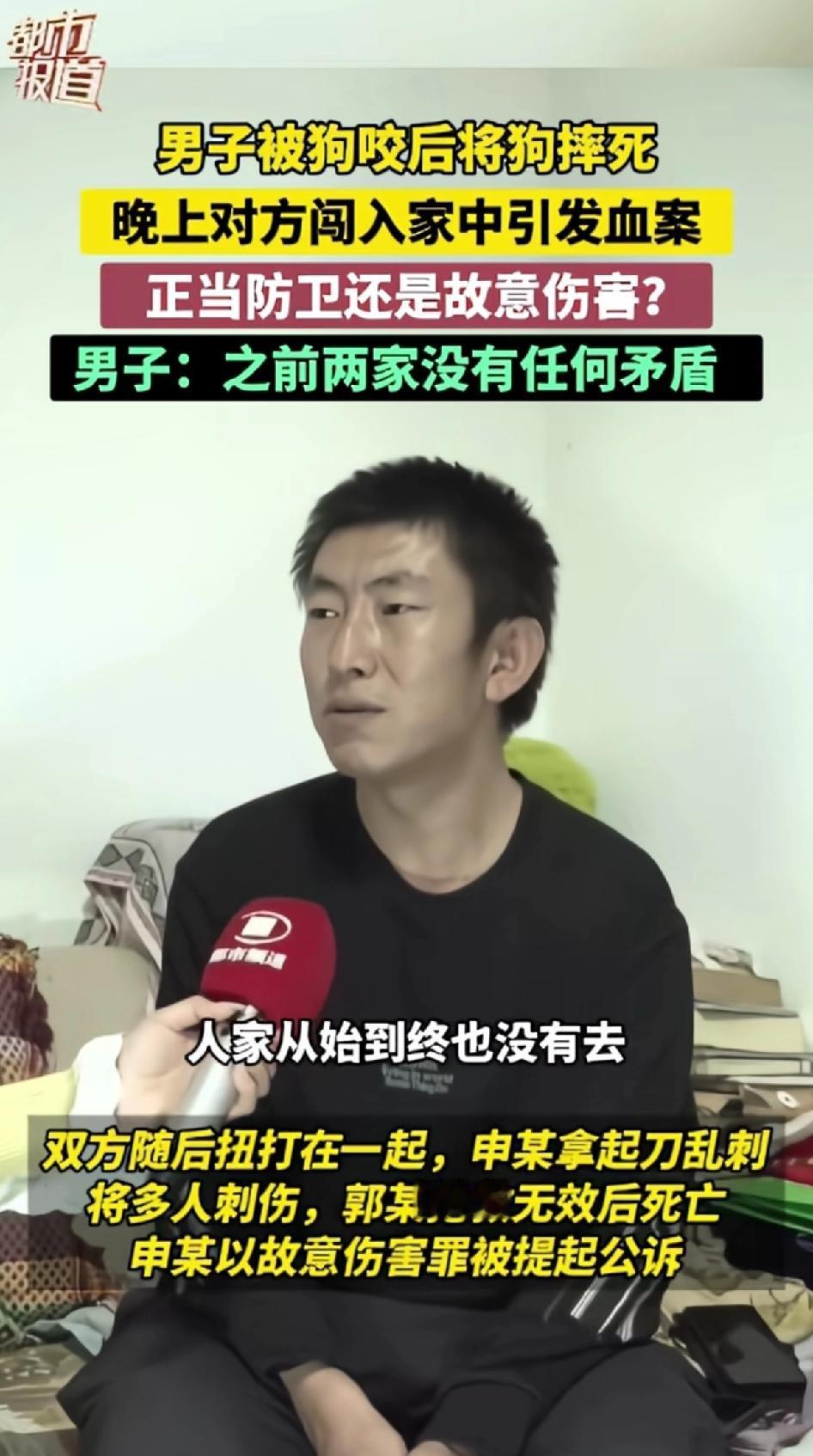 男子被狗咬后将狗摔死,晚上对方闯入家中双方起争执引发血案! 正当防卫还是故意伤害?还真不好界定。 被告人申某儿子:之前两家没有任何矛盾,因为狗咬人事件两家现在成了仇人! 被告人儿子所讲被狗咬伤后一怒之下摔死了狗,晚上狗主人(郭某)来到自己家理论,将自己家的玻璃砸碎,并踹开大门,随后俩人发生争执。 双方扭打在一起,申某拿起刀乱刺将多人刺伤,郭某受伤严重抢救无效后死亡! 申某以故意伤害罪被提起公诉! 从法律角度讲,男子被狗咬时摔死狗,这不算正当防卫,而是紧急避险,毕竟正当防卫针对的是人,紧急避险对象能是动物。 可到了晚上,狗主人闯入家中,男子若反击,这性质就复杂了。 要是为了制止对方正在进行的不法侵害,那可能算正当防卫;但要是反击过度,就可能成故意伤害。 这其中的界限很微妙,得看具体情况,比如冲突的激烈程度、双方的行为动作等。 申某刺伤多人,当时应该比较混乱,现在郭某已死,申某犯了故意伤害罪! 本来申某被狗咬伤摔死狗也没什么大不了的,现在又把狗主人杀了,那性质又不一样了! 以为一条狗快搭进两条人命了,碰到事情不要冲动,冷静处理! 狗主人的一贯说法就是我家狗不咬人,其实咬人的狗不能留!打不改就处理了,否则早晚会惹事! 除非每天关在家里不出门,因狗咬人的事件频繁发生,狗主人不要一味地宠爱动物,理性养狗,不要给自己招惹不必要的麻烦。