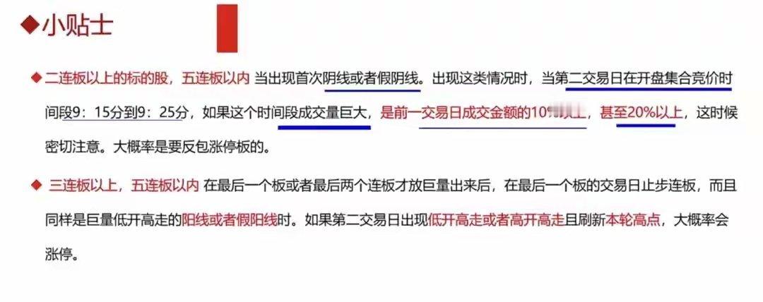 1. 二连板标的在二到五板之间,首次出现阴线或假阴线的第二天交易日集合竞价9点15到9点25成交量放大前一交易日10%甚至20%,股票大概率涨停。