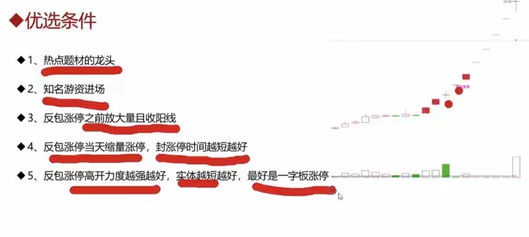 3. 优选热点题材的龙头,有知名游资进场,反包涨停之前放大量且收阳线,反包涨停当天缩量涨停,封单时间短、高开力度强、实体越早越好,最好是一字板。