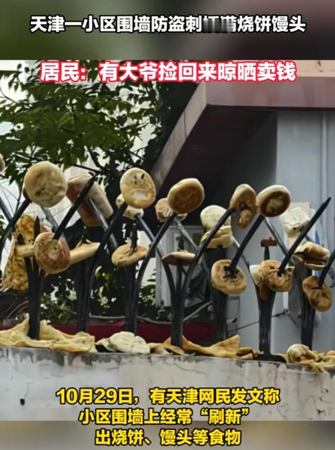 天津一小区围墙防盗刺插满烧饼馒头这我就想知道收这个干什么?这些粮食去了哪里?我们小区有老头老太太扒垃圾桶,捡垃圾桶里面的粮食晒干卖这些都是用来干啥的有知道的不?
