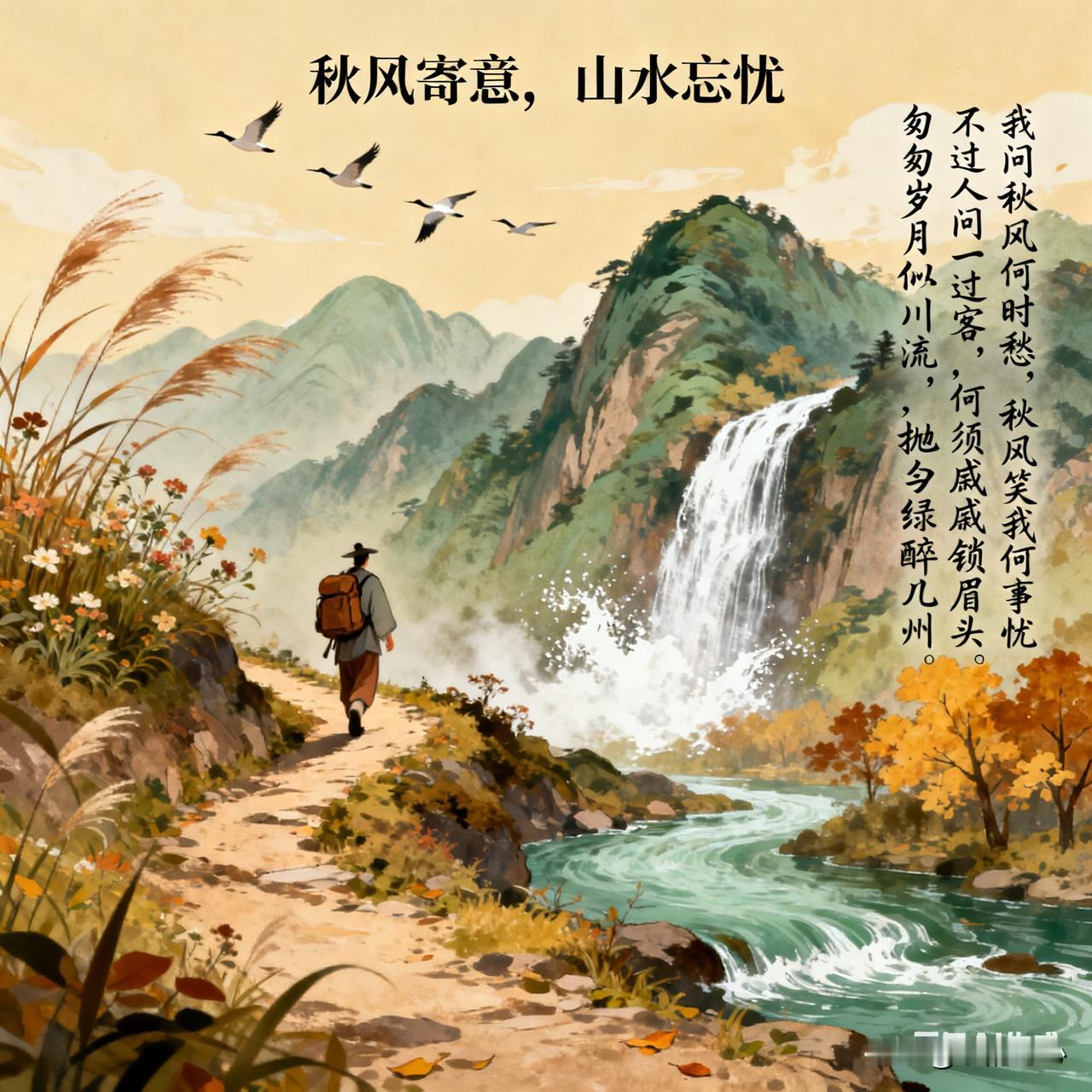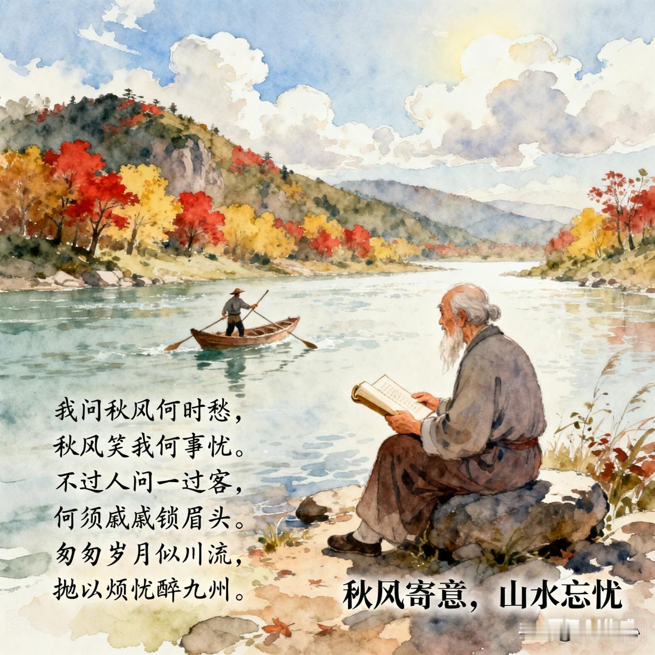 《秋风寄意*山水忘忧》乐韵诗心原创诗词: 我问秋风何时愁, 秋风笑我何事忧。 不过人间一过客, 何须戚戚锁眉头。 匆匆岁月似川流, 且惜今朝景里游。 青山绿水常相候, 抛却烦忧醉九州。