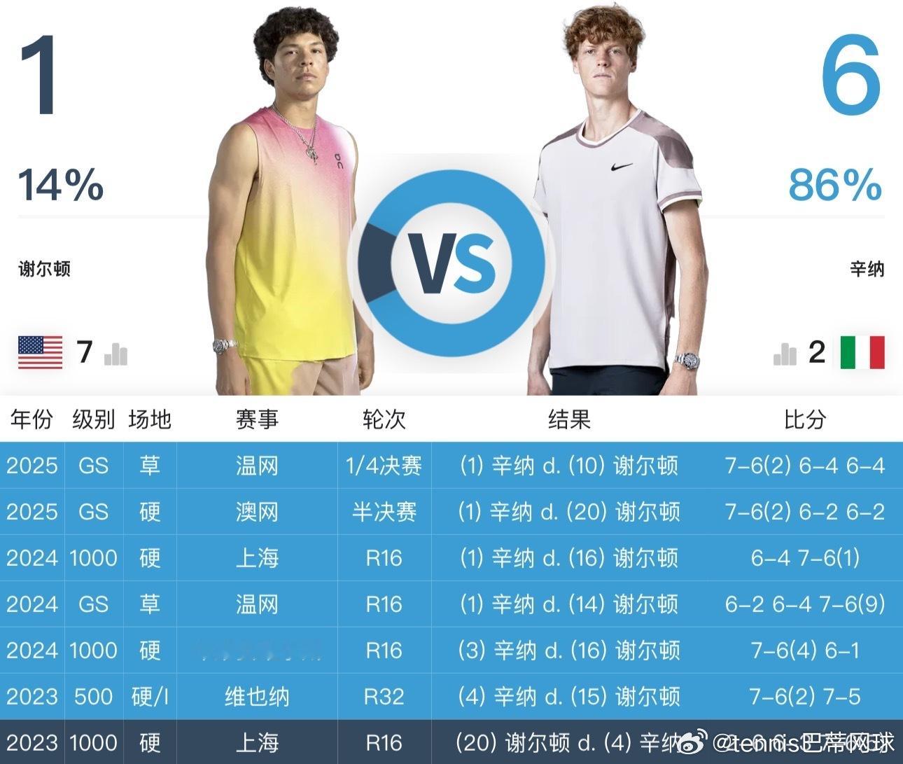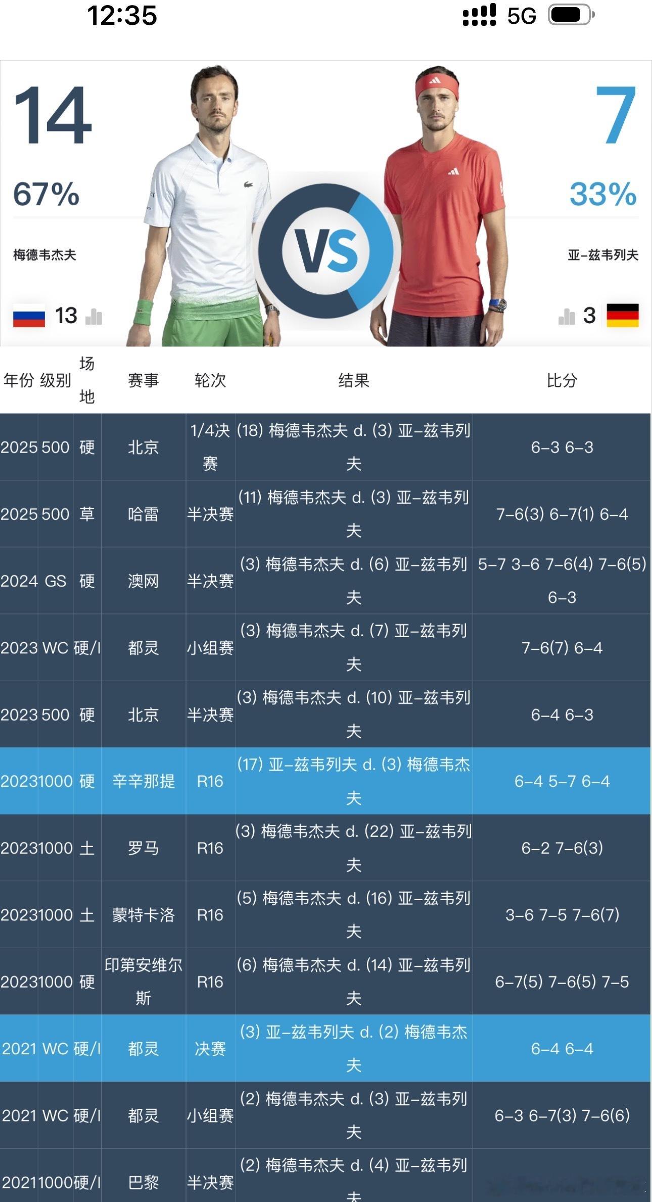 下半夜的两场比赛对阵记录梅总5连胜兹维列夫,辛纳6连胜谢尔顿,失眠的朋友可以追剧