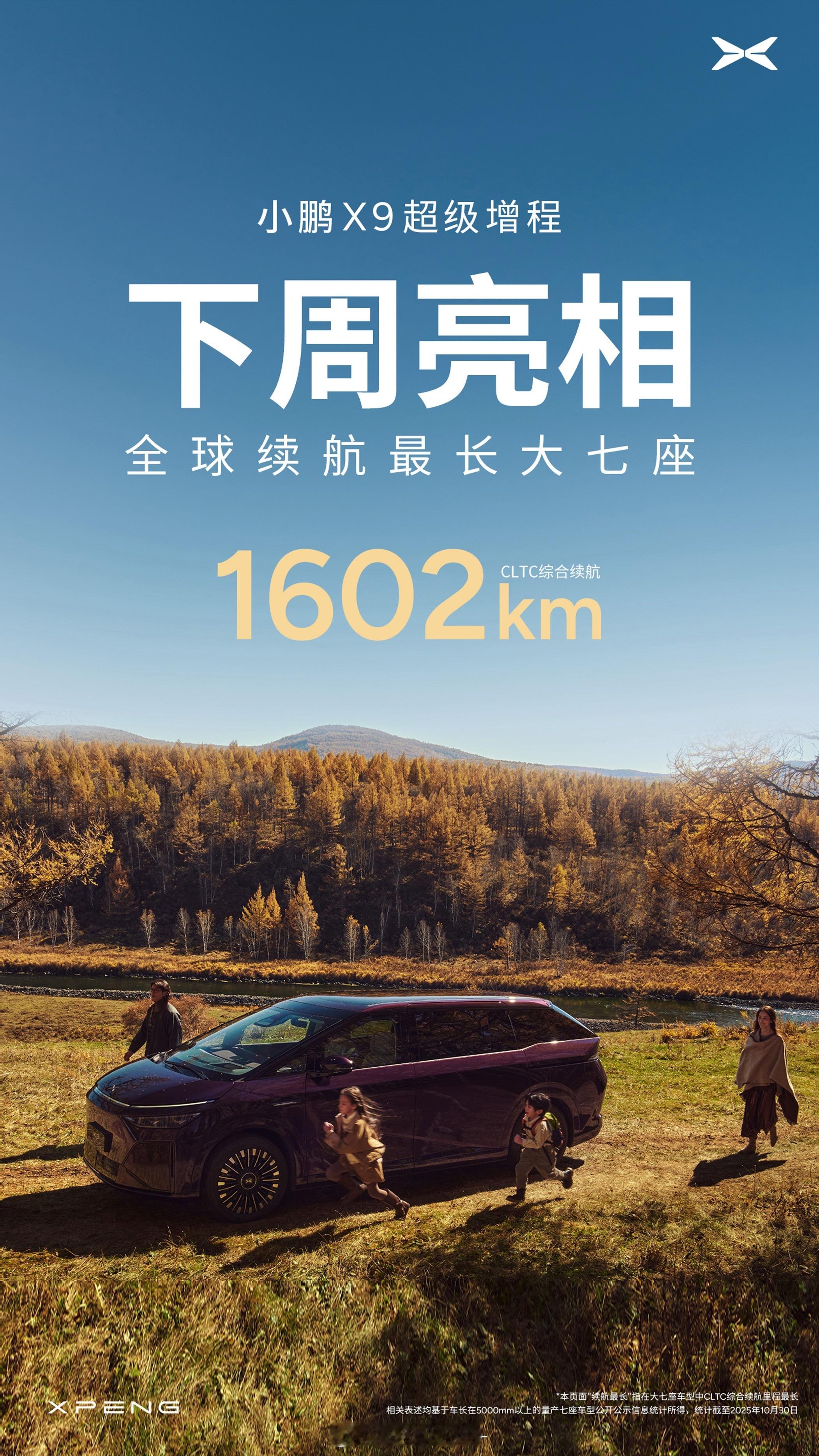 官宣!全球续航最长大七座小鹏X9超级增程下周正式亮相!