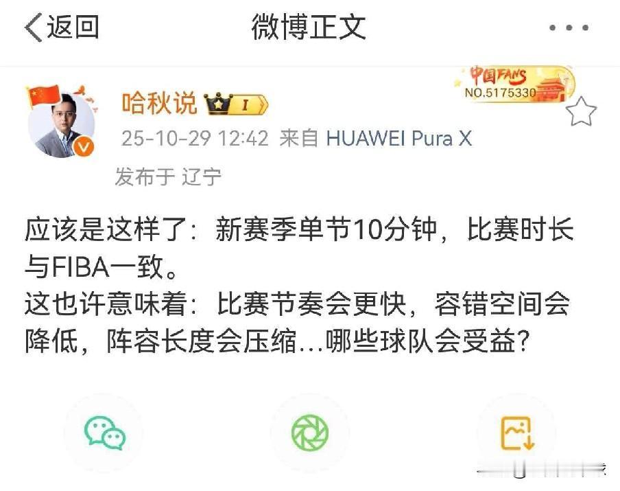 CBA新赛季或采用单节10分钟赛制!年轻球员出场时间堪忧 近日据媒体人哈秋说报道,新赛季CBA将和国际篮联接轨,采取单节10分钟的赛制,同时他表示这样意味着节奏更快、容错空间更少,阵容长度也会压缩,哪些球队会受益。 其实这样的赛制早就有风声传出来,只是一直没有落实,单节10分钟的赛制意味着每场比赛要缩短8分钟,那样的话很多比赛主力球员就会打满全场,看看前面两个赛季胡金秋、孙铭徽等人都是场均出场40分钟以上,这就意味着替补球员出场时间会更少,特别是年轻球员很难得到出场时间去培养,欧洲都是采用这样的赛制,但是人家有次级联赛、第三极联赛可以锻炼年轻球员,CBA采用这样的赛制虽然会提升比赛强度,但是对于年轻球员来说绝对是噩梦,至于对于哪支球队有利,那肯定是对于那些阵容深度不够的球队有利。