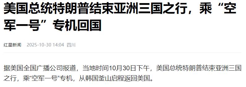 特朗普一点面子都没有给韩国,跟我们谈完,特朗普就返回美国了! 按照白宫早前公布的消息,特朗普在10月29日上午准时降落在韩国釜山金海国际机场。这可是他开启第二任期后第一次访韩,也是第三次以美国总统身份踏上韩国土地。 下了飞机,特朗普并未多耽误,直接换乘专用直升机飞了80多公里赶到庆州。他先去APEC工商领导人峰会发表主旨演讲,对着各国企业家谈了半天亚太经贸合作,紧接着又马不停蹄地赶往国立庆州博物馆,和韩国总统李在明碰面。 两人不光走了欢迎仪式的流程,还带着各自团队开了大范围会议,中午连工作午餐都没落下,席间聊的都是关税磋商、同盟现代化这些实打实的议题。 那会儿看这安排,谁都觉得这是一场规规矩矩、考虑周全的正式访问。不过要说最让外界牵肠挂肚的,还得是另一场会面——中美领导人会晤。 早在特朗普出发前,我外交部就正式宣布,将在10月30日于釜山同特朗普举行领导人会晤。 这事儿当时就成了外媒的焦点,毕竟这是特朗普第二任期以来,中美两国领导人头一回面对面坐下来谈,不少人都盼着这能给两国关系找个新方向。 10月30日那天,釜山机场的蓝屋贵宾室早就准备好了,双方如期碰面。算下来,这是时隔6年的再次相见,气氛倒挺轻松,特朗普一见面就笑着说“相信会有非常成功的会晤”,虽然没搞太复杂的仪式,但明眼人都知道这事儿分量有多重。 谁也没料到,会晤刚一结束,特朗普立马就变了画风。他连贵宾室的沙发都没坐热,就带着随行人员往机场跑,径直登上了空军1号。引擎一启动,直接朝着美国方向飞去,半点儿停留的意思都没有。 要知道,这次APEC领导人非正式会议明明10月31日才开幕,一直要开到11月1日,韩国总统李在明还打算借着东道主身份推动发表《庆州宣言》,重建多边主义秩序呢。 特朗普这一走,不光错过了整场会议,之前跟韩国方面聊到一半的议题也没法接着谈了。 其实往深了想,这事儿早有苗头。回头看白宫最初的行程表就会发现,上面明明白白写着特朗普要在APEC开幕前回美国,跟中方的会晤本就是他这次亚洲行的“压轴戏”。 说白了,他来韩国出席APEC工商峰会、跟李在明吃饭会谈,更像是“顺带”的安排,真正让他不远万里飞过来的核心,从来都是这场中美会晤。