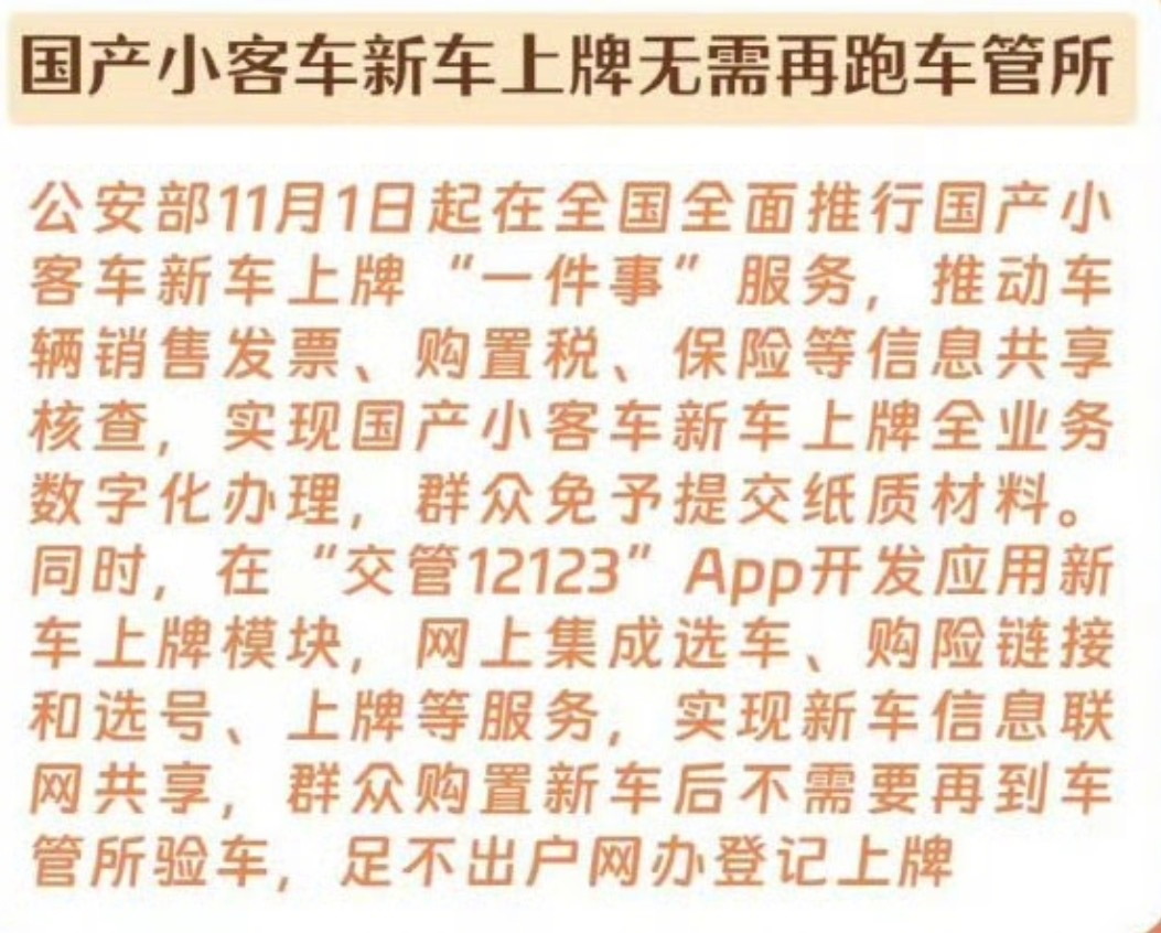 11月一批新规将施行好消息:新车上牌、选号等等服务不需要跑车管所了坏消息:早就开