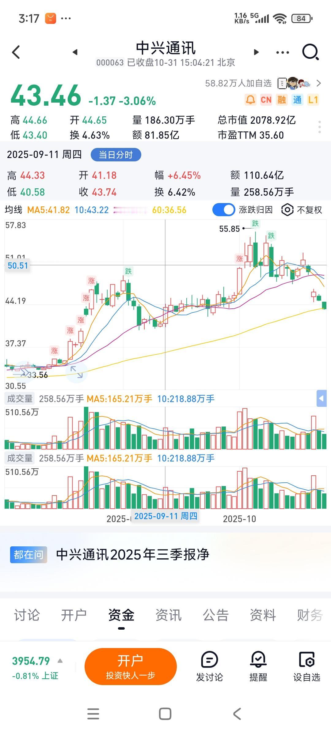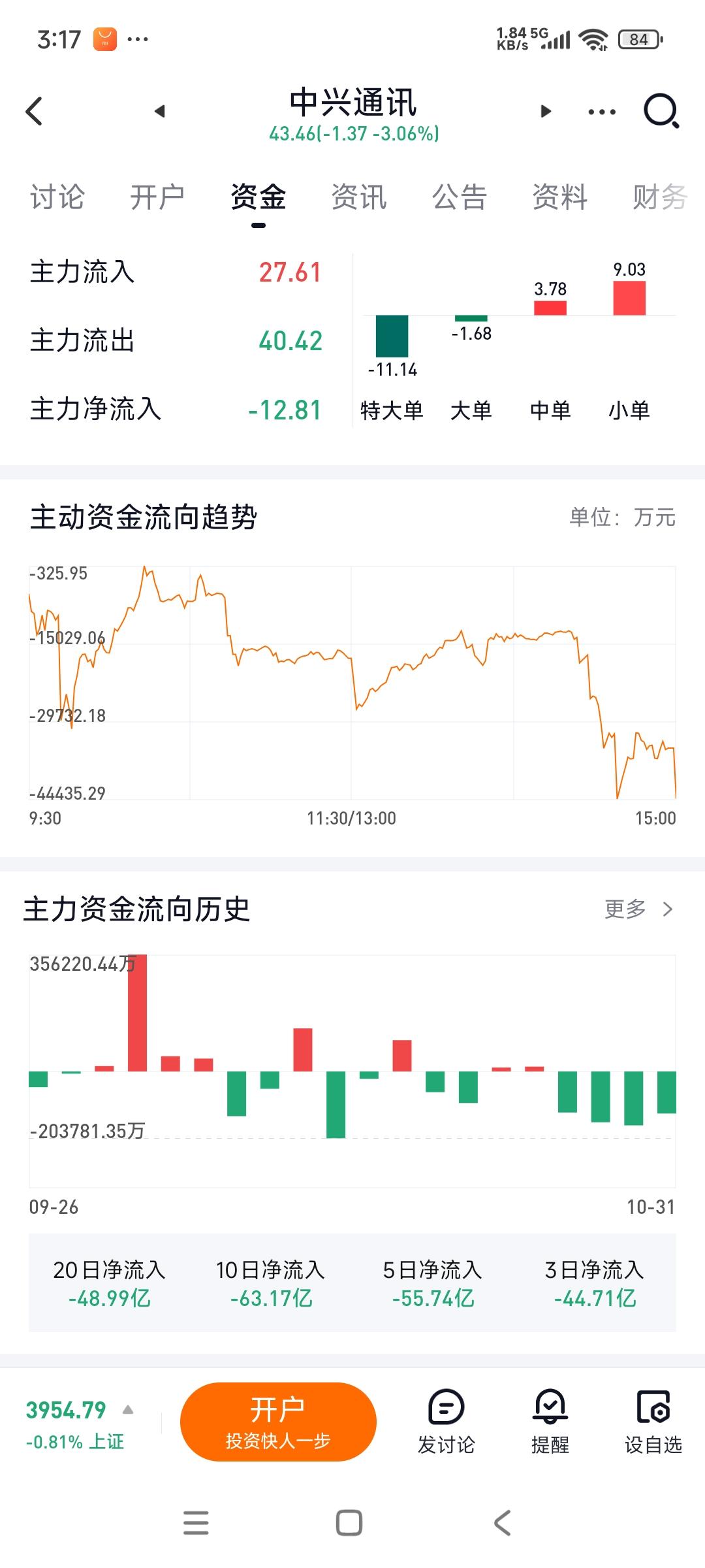 中兴通讯没有主力了,都走了,连续大跌四天,主力净流出五六十亿资金,股价跌了十四五个点,今日直接跌到了60日线位置... 下周就是十一月,如果大盘依旧不稳,60日线也会撑不住... 不要进来抄底,也没必要进来搏反弹,外面好公司太多了,而这家公司的预期,太差了... 之前我还很看好它的第二增长曲线的,可三季度报打了脸... 当然,都这个位置了,我也不卖了,做一个僵尸股东...[捂脸] 等它跌到36块以下,你们再进来吧...